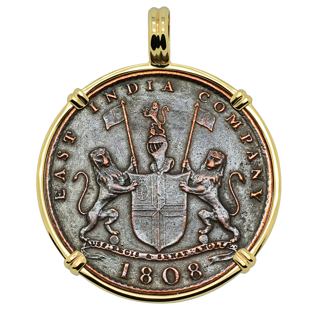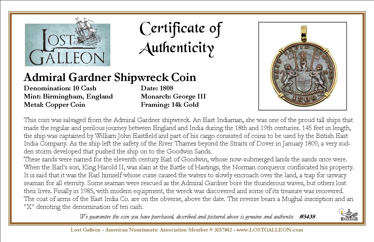 This coin was salvaged from the Admiral Gardner shipwreck. An East Indiaman, she was one of the proud tall ships that made the regular and perilous journey between England and India during the 18th and 19th centuries. 145 feet in length, the ship was captained by William John Eastfield and part of his cargo consisted of coins to be used by the British East India Company. As the ship left the safety of the River Thames beyond the Straits of Dover in January 1809, a very sudden storm developed that pushed the ship on to the Goodwin Sands.