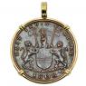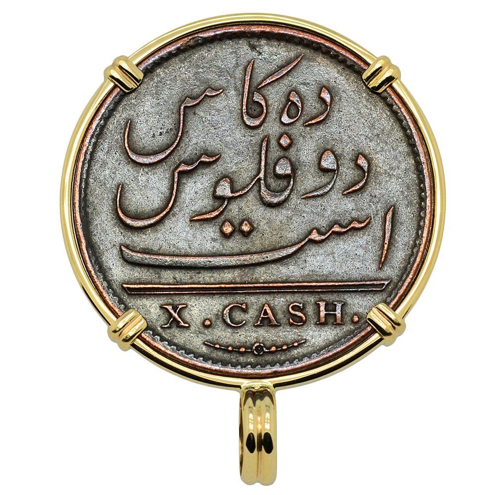 These sands were named for the eleventh century Earl of Goodwin, whose now-submerged lands the sands once were. When the Earl's son, King Harold II, was slain at the Battle of Hastings, the Norman conqueror confiscated his property. It is said that it was the Earl himself whose curse caused the waters to slowly encroach over the land, a trap for unwary seaman for all eternity. Some seaman were rescued as the Admiral Gardner bore the thunderous waves, but others lost their lives. Finally in 1985, with modern equipment, the wreck was discovered and some of its treasure was recovered. The coat of arms of the East India Co. are on the obverse, above the date. The reverse bears a Mughal inscription and an "X" denoting the denomination of ten cash.