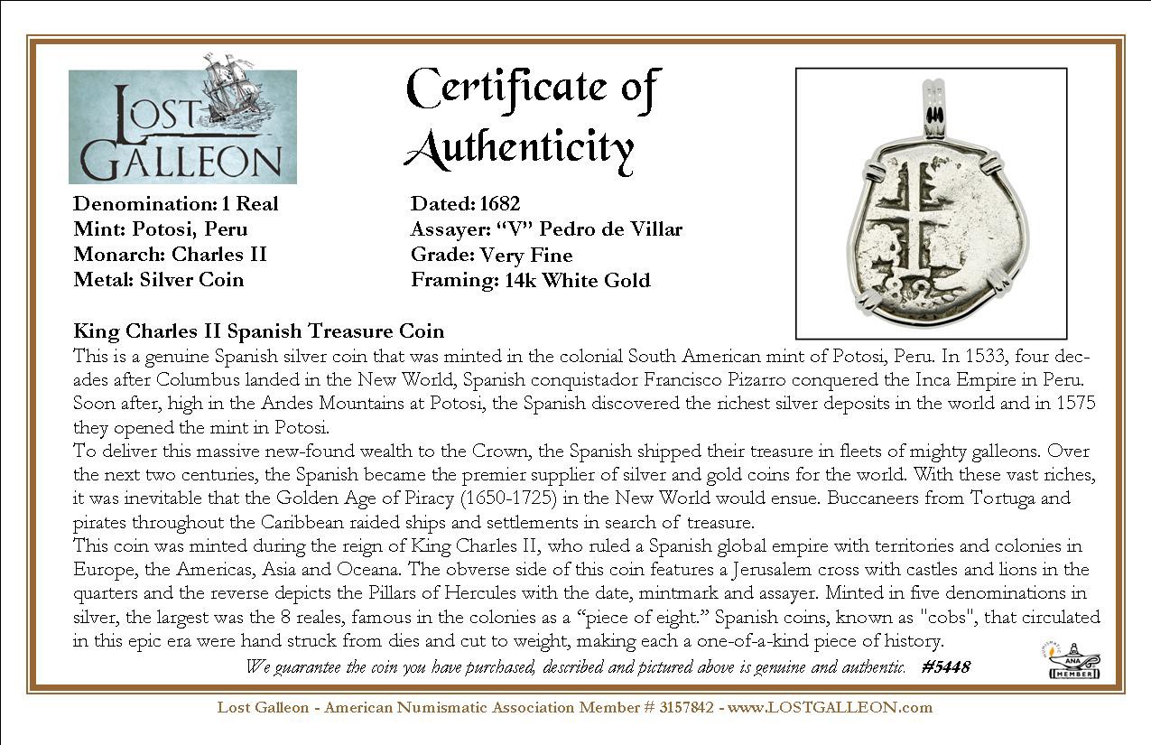 This coin was minted during the reign of King Charles II, who ruled a Spanish global empire with territories and colonies in Europe, the Americas, Asia and Oceana. The obverse side of this coin features a Jerusalem cross with castles and lions in the quarters and the reverse depicts the Pillars of Hercules with the date, mintmark and assayer. Minted in five denominations in silver, the largest was the 8 reales, famous in the colonies as a “piece of eight.” Spanish coins, known as "cobs", that circulated in this epic era were hand struck from dies and cut to weight, making each a one-of-a-kind piece of history.