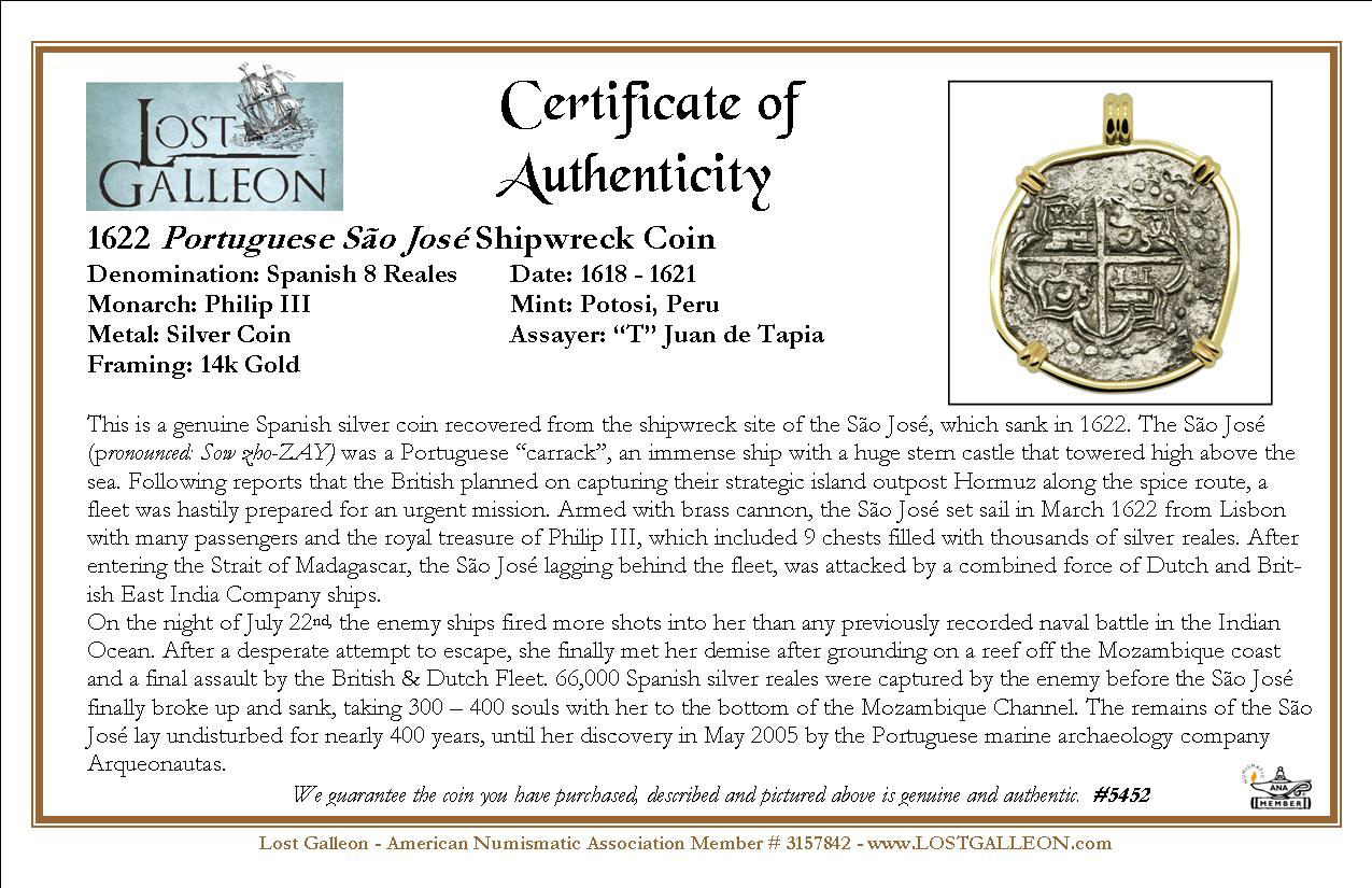 Arqueonautas salvagers certificate included. This is a genuine Spanish silver coin recovered from the shipwreck site of the São José, which sank in 1622. The São José (pronounced: Sow zho-ZAY) was a Portuguese “carrack”, an immense ship with a huge stern castle that towered high above the sea. Following reports that the British planned on capturing their strategic island outpost Hormuz along the spice route, a fleet was hastily prepared for an urgent mission. Armed with brass cannon, the São José set sail in March 1622 from Lisbon with many passengers and the royal treasure of Philip III, which included 9 chests filled with thousands of silver reales. After entering the Strait of Madagascar, the São José lagging behind the fleet, was attacked by a combined force of Dutch and British East India Company ships.