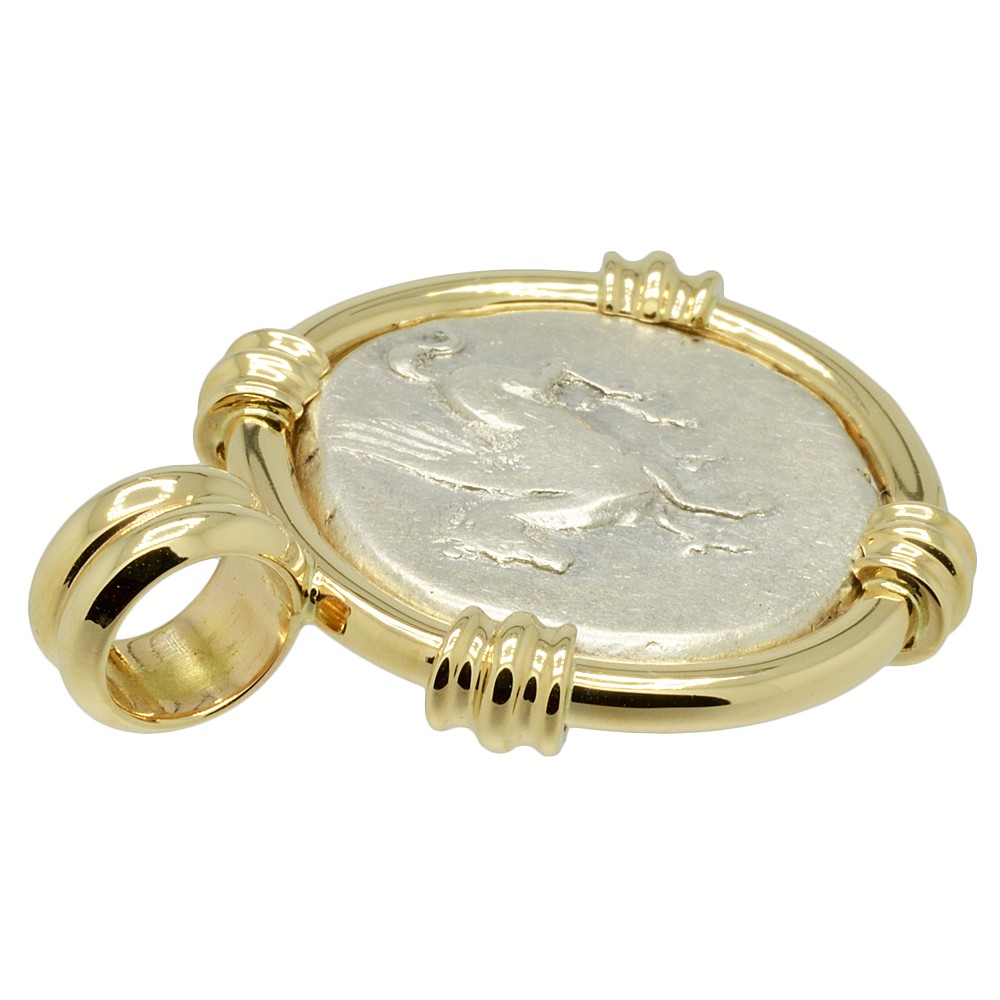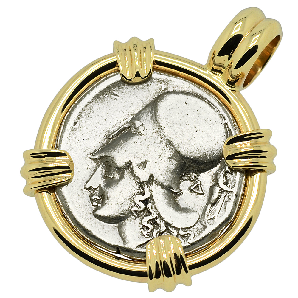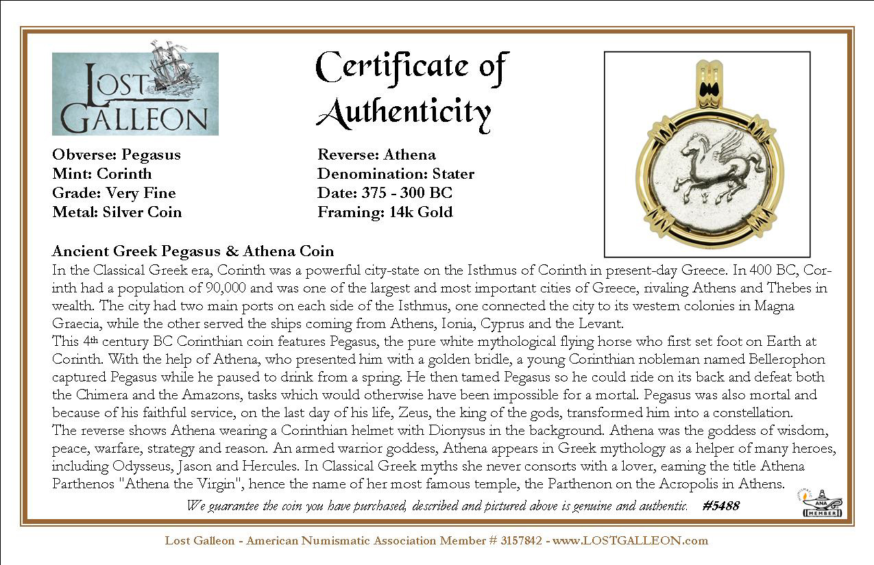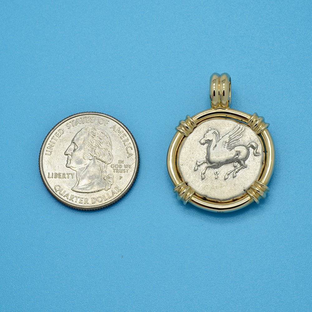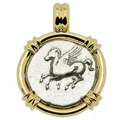 This 4th century BC Corinthian coin features Pegasus, the pure white mythological flying horse who first set foot on Earth at Corinth. With the help of Athena, who presented him with a golden bridle, a young Corinthian nobleman named Bellerophon captured Pegasus while he paused to drink from a spring. He then tamed Pegasus so he could ride on its back and defeat both the Chimera and the Amazons, tasks which would otherwise have been impossible for a mortal. Pegasus was also mortal and because of his faithful service, on the last day of his life, Zeus, the king of the gods, transformed him into a constellation.