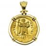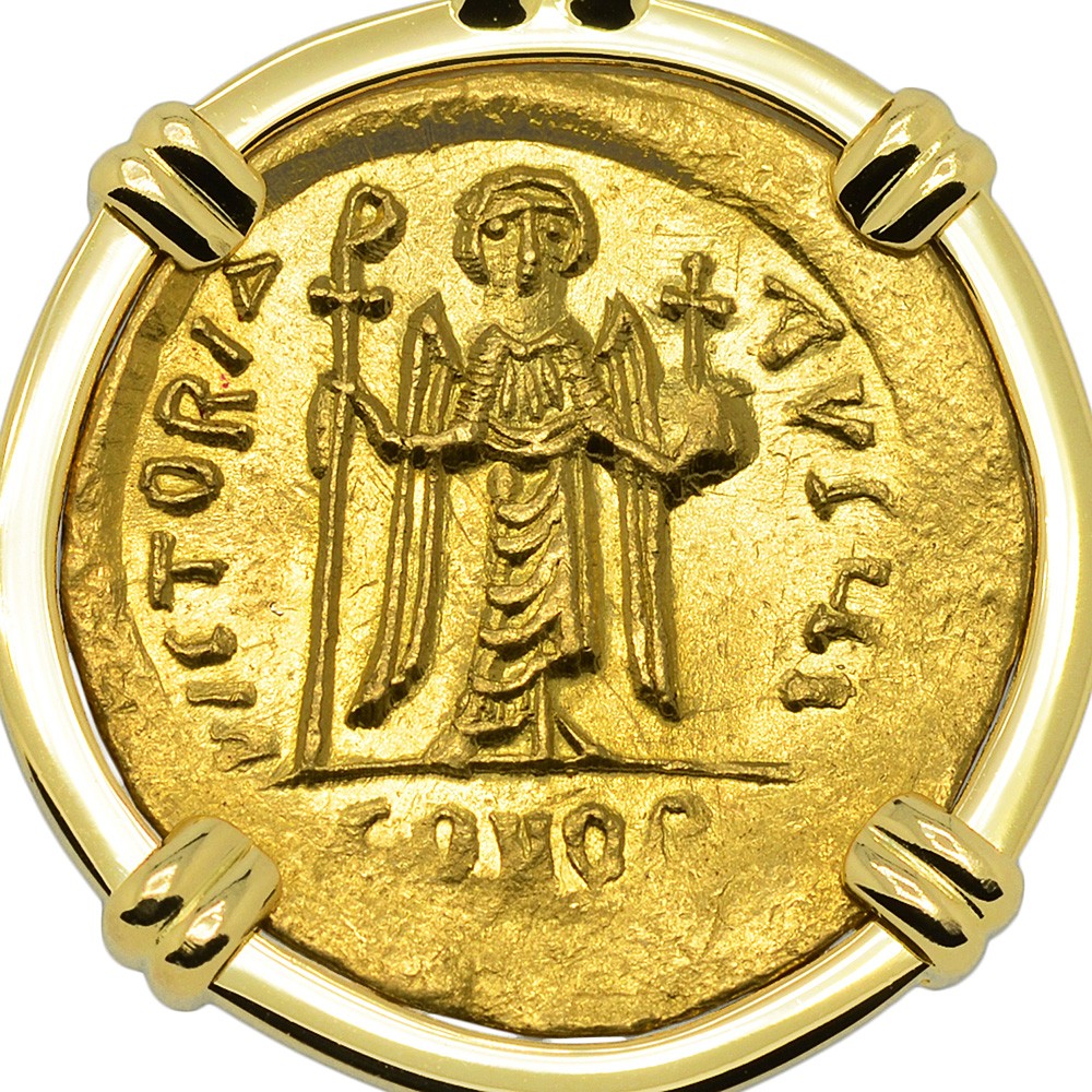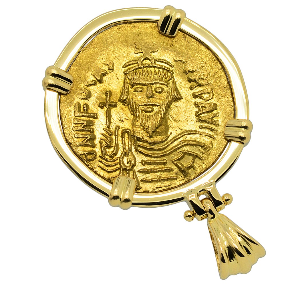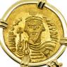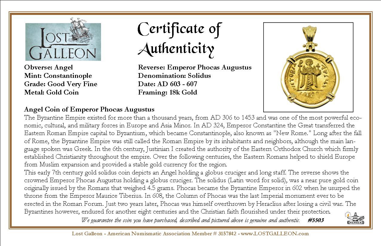 This early 7th century gold solidus coin depicts an Angel holding a globus cruciger and long staff. The reverse shows the crowned Emperor Phocas Augustus holding a globus cruciger. The solidus (Latin word for solid), was a near pure gold coin originally issued by the Romans that weighed 4.5 grams. Phocas became the Byzantine Emperor in 602 when he usurped the throne from the Emperor Maurice Tiberius. In 608, the Column of Phocas was the last Imperial monument ever to be erected in the Roman Forum. Just two years later, Phocas was himself overthrown by Heraclius after losing a civil war. The Byzantines however, endured for another eight centuries and the Christian faith flourished under their protection.