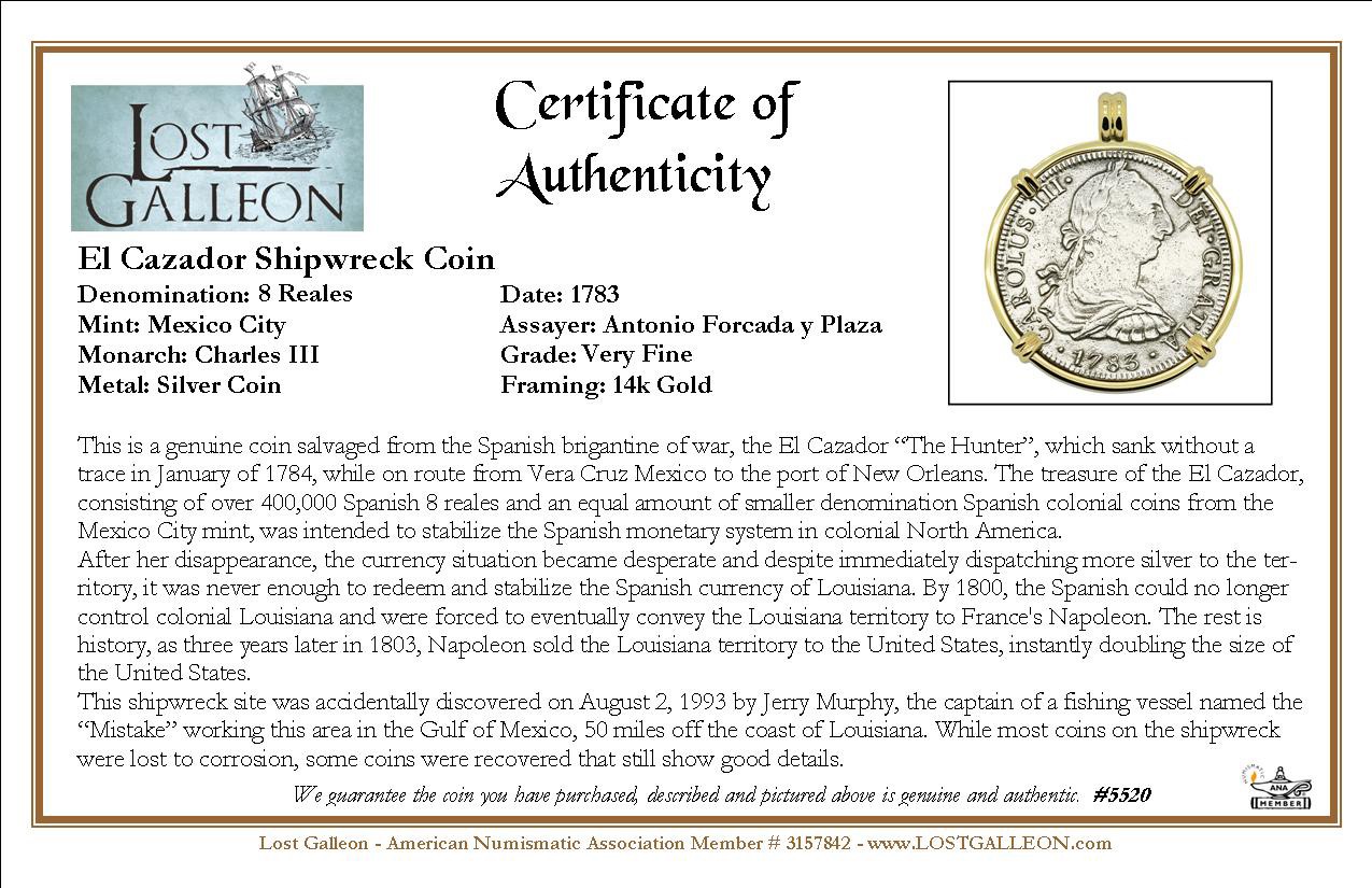 El Cazador shipwreck coin certificate also included. This is a genuine coin salvaged from the Spanish brigantine of war, the El Cazador “The Hunter”, which sank without a trace in January of 1784, while on route from Vera Cruz Mexico to the port of New Orleans. The treasure of the El Cazador, consisting of over 400,000 Spanish 8 reales and an equal amount of smaller denomination Spanish colonial coins from the Mexico City mint, was intended to stabilize the Spanish monetary system in colonial North America.