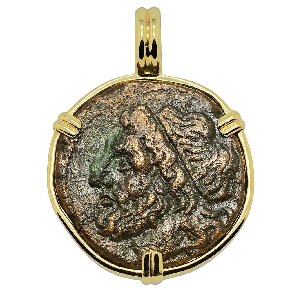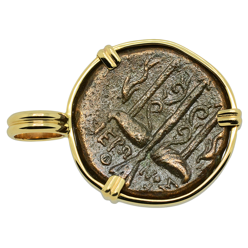 This coin features the head of Poseidon wearing a tainia. In Greek mythology, Poseidon was the god of the sea and storms as well as the "Earth-Shaker" of earthquakes. Known as Neptune by the Romans, he was a major Olympian god and the brother of Zeus and Hades. Sailors believed Poseidon created new islands and they would pray for him to allow calm seas and a safe voyage. If offended or ignored, Poseidon would strike the ground with his trident and cause chaotic springs, earthquakes, drownings and shipwrecks. The reverse of this coin shows his ornamented trident with dolphins on each side.
