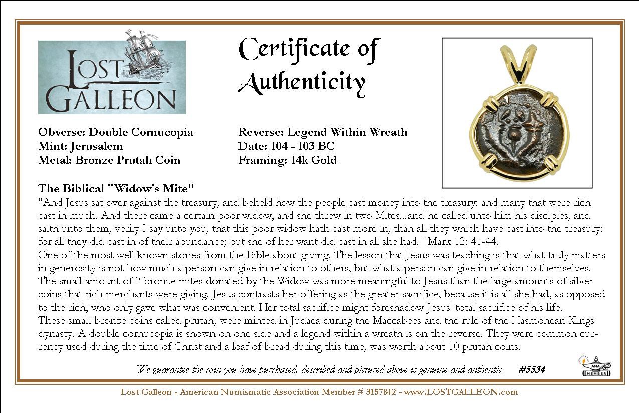 These small bronze coins called prutah, were minted in Judaea during the Maccabees and the rule of the Hasmonean Kings dynasty. A double cornucopia is shown on one side and a legend within a wreath is on the reverse. They were common currency used during the time of Christ and a loaf of bread during this time was worth about 10 prutah coins.