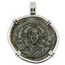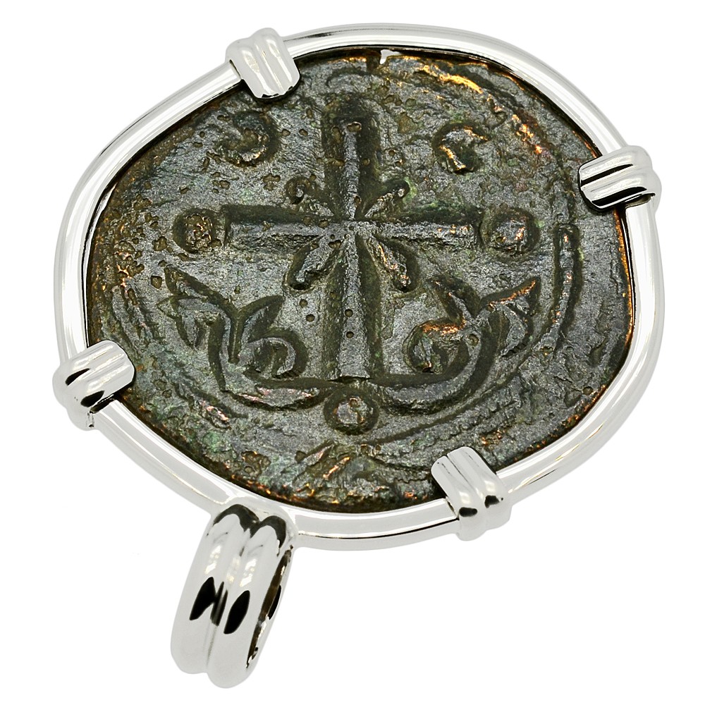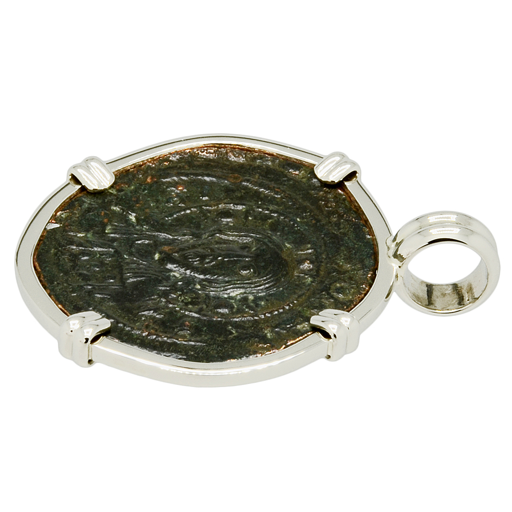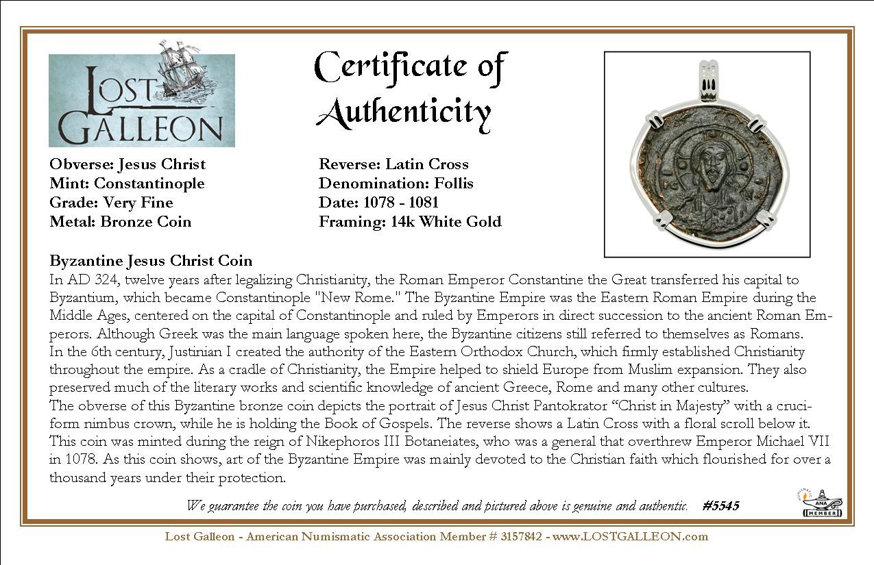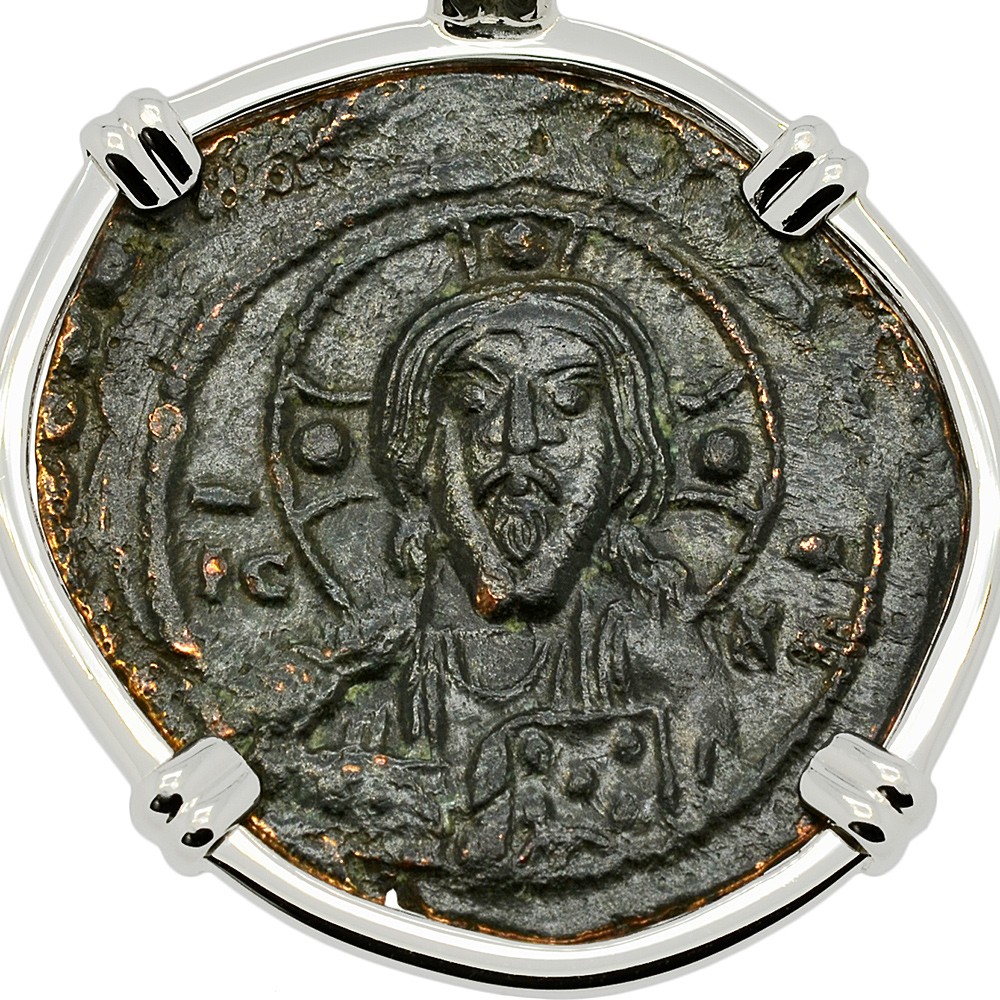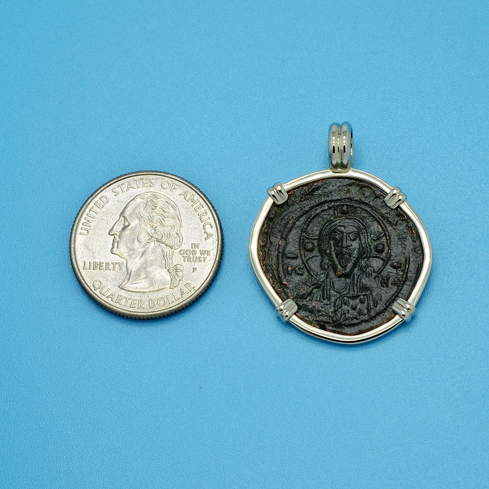 The obverse of this Byzantine bronze coin depicts the portrait of Jesus Christ Pantokrator “Christ in Majesty” with a cruciform nimbus crown, while he is holding the Book of Gospels. The reverse shows a Latin Cross with a floral scroll below it. This coin was minted during the reign of Nikephoros III Botaneiates, who was a general that overthrew Emperor Michael VII in 1078. As this coin shows, art of the Byzantine Empire was mainly devoted to the Christian faith which flourished for over a thousand years under their protection.