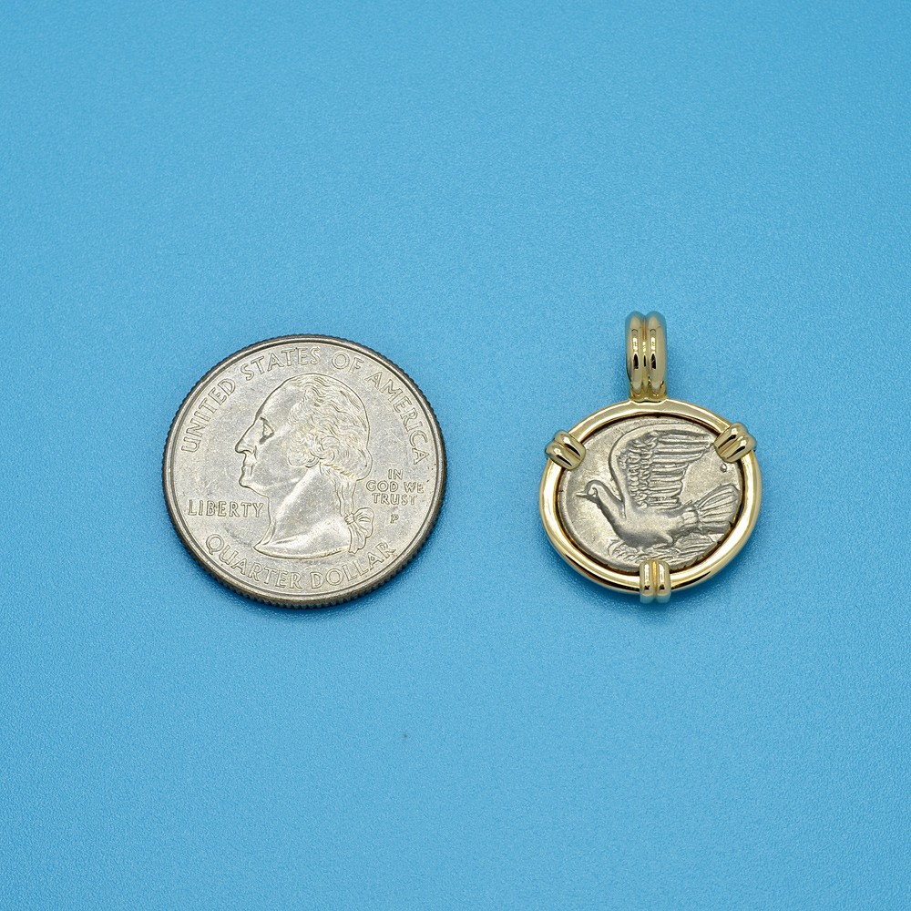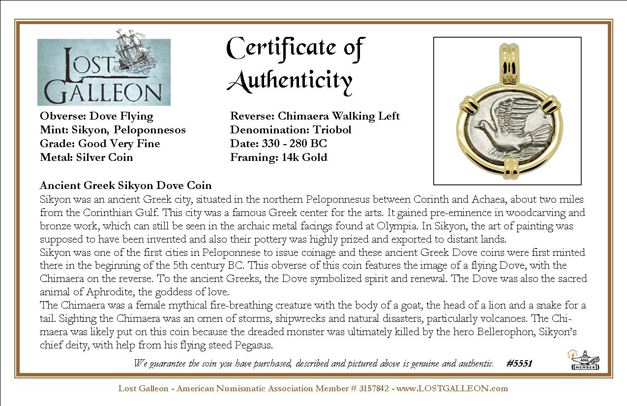 Sikyon was one of the first cities in Peloponnese to issue coinage and these ancient Greek Dove coins were first minted there in the beginning of the 5th century BC. This obverse of this coin features the image of a flying Dove, with the Chimaera on the reverse. To the ancient Greeks, the Dove symbolized spirit and renewal. The Dove was also the sacred animal of Aphrodite, the goddess of love.