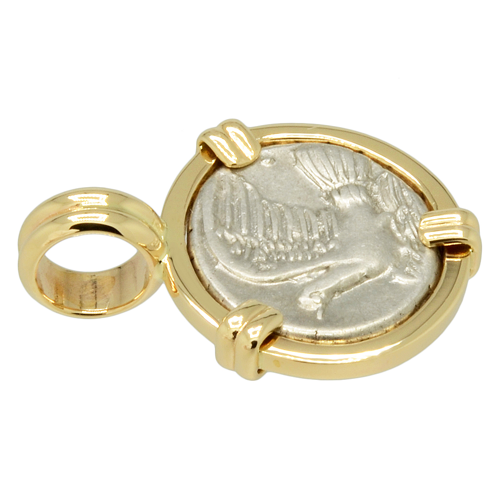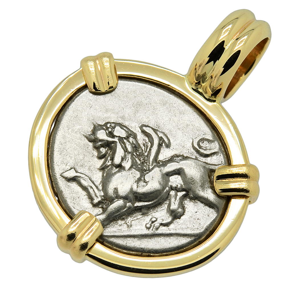 The Chimaera was a female mythical fire-breathing creature with the body of a goat, the head of a lion and a snake for a tail. Sighting the Chimaera was an omen of storms, shipwrecks and natural disasters, particularly volcanoes. The Chimaera was likely put on this coin because the dreaded monster was ultimately killed by the hero Bellerophon, Sikyon’s chief deity, with help from his flying steed Pegasus.