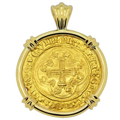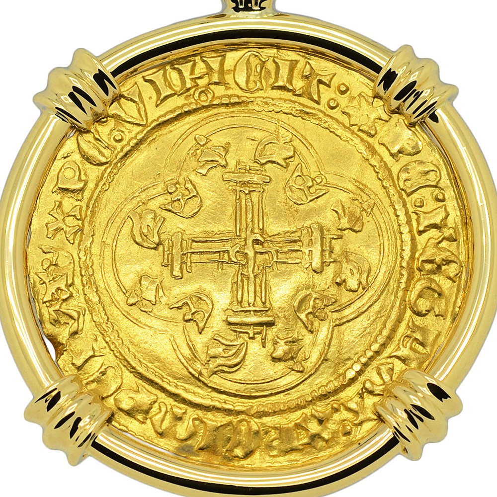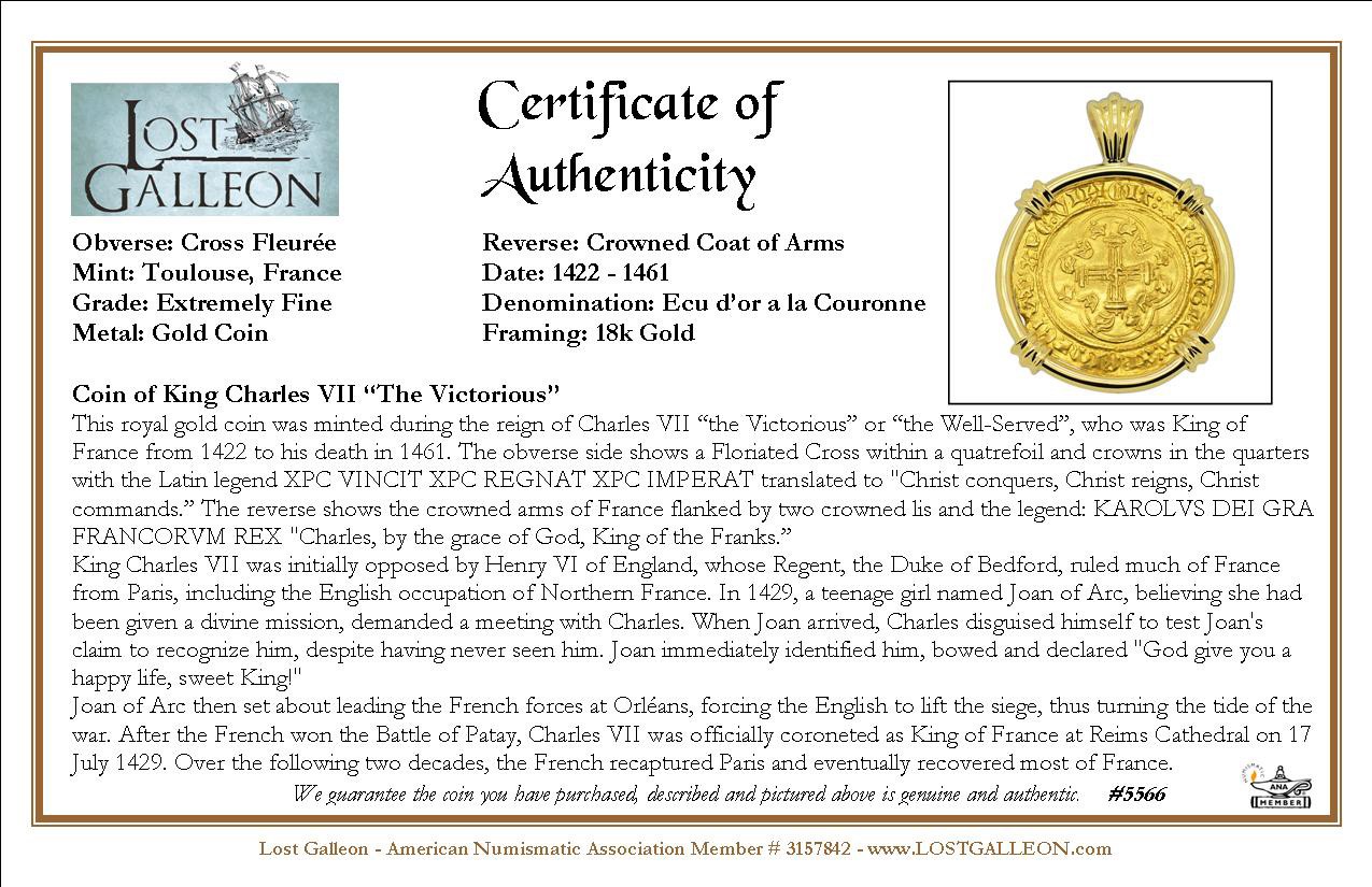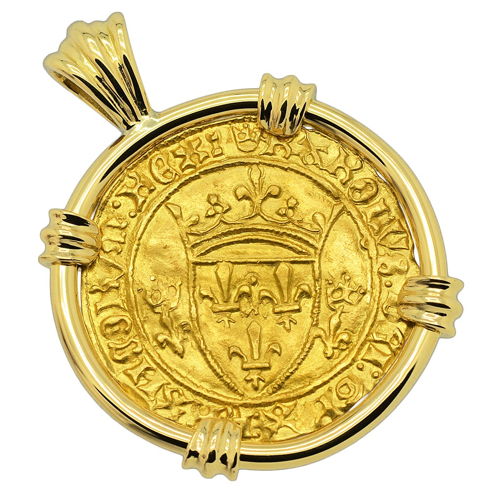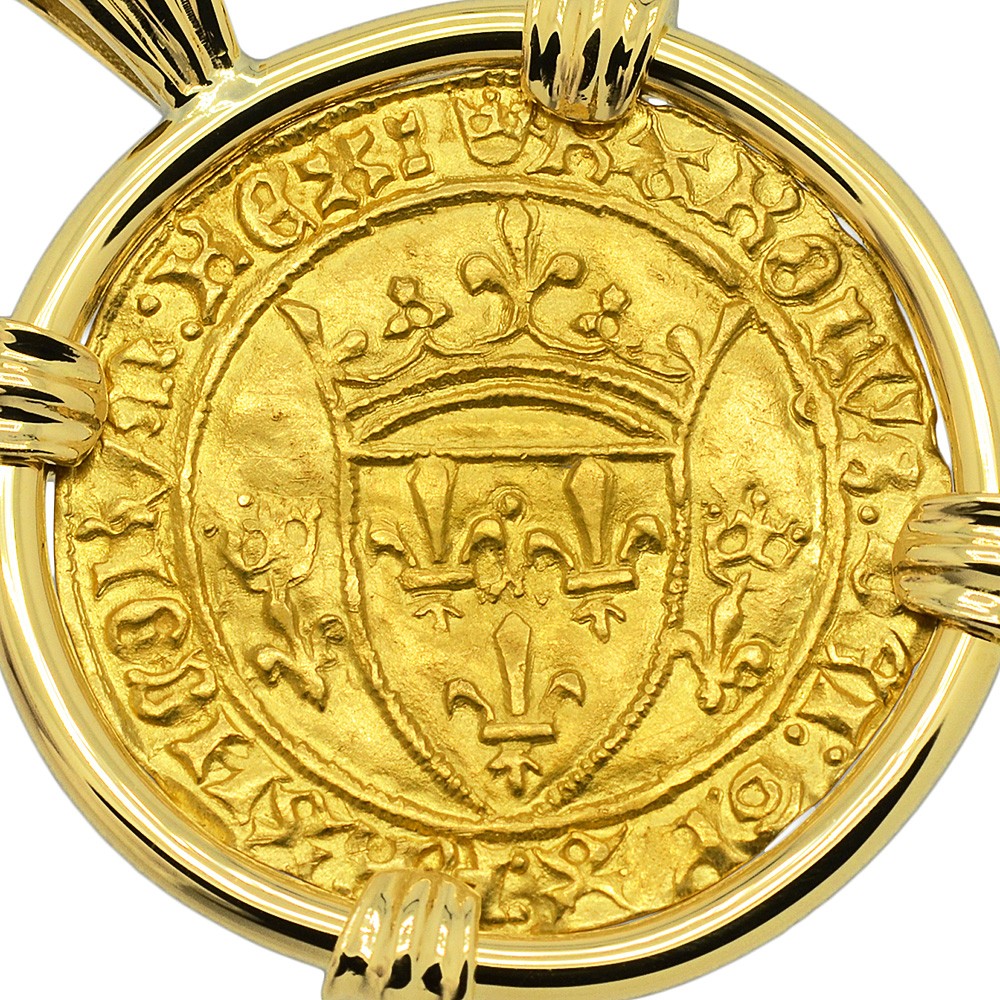 This royal gold coin was minted during the reign of Charles VII “the Victorious” or “the Well-Served”, who was King of France from 1422 to his death in 1461. The obverse side shows a Floriated Cross within a quatrefoil and crowns in the quarters with the Latin legend XPC VINCIT XPC REGNAT XPC IMPERAT translated to "Christ conquers, Christ reigns, Christ commands.” The reverse shows the crowned arms of France flanked by two crowned lis and the legend: KAROLVS DEI GRA FRANCORVM REX "Charles, by the grace of God, King of the Franks.”