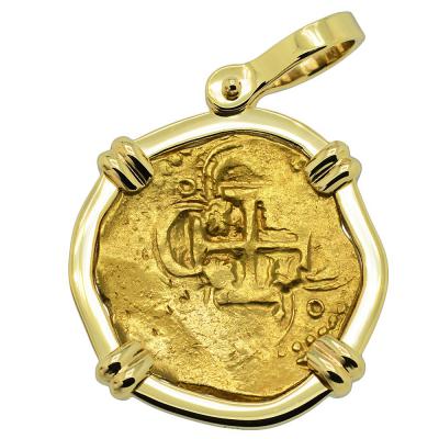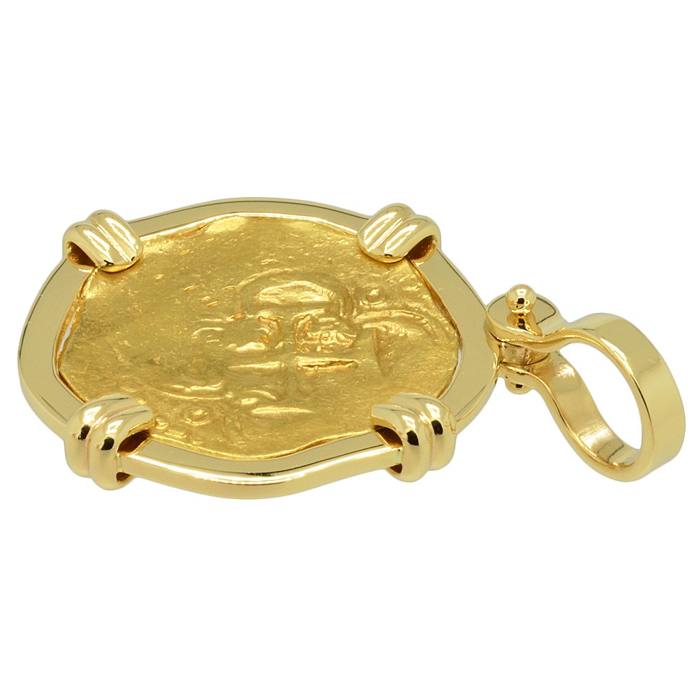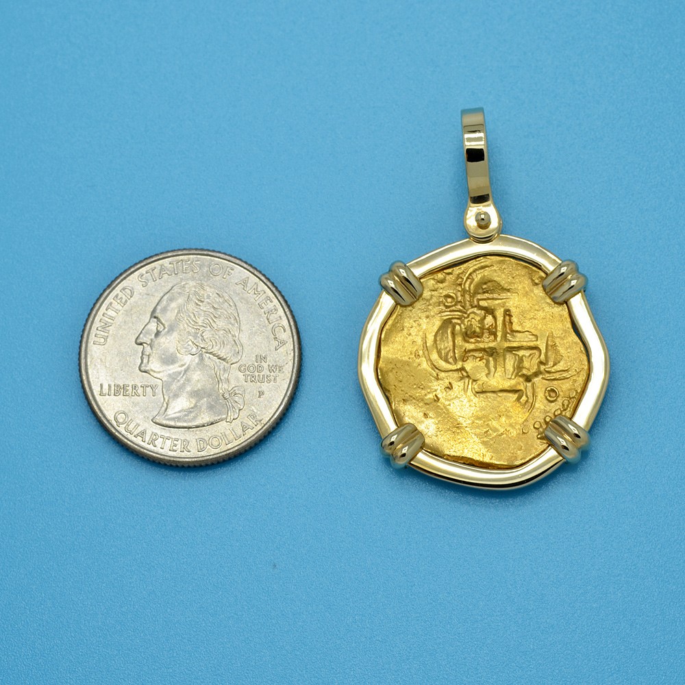 Spanish gold coinage of this historical period was decreed by the King to be 22 karats and were hand struck from dies and cut to weight, making each coin a one-of-a-kind piece of history. Minted in five denominations in gold, the largest was the 8 escudos, however the 2 escudos was famous in the colonies and among pirates as a "doubloon.” A common working man at this time would have to work 4 months to earn a single doubloon.