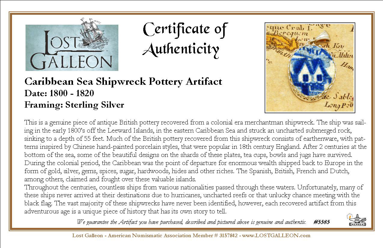 This is a genuine piece of antique British pottery recovered from a colonial era merchantman shipwreck. The ship was sailing in the early 1800’s off the Leeward Islands, in the eastern Caribbean Sea and struck an uncharted submerged rock, sinking to a depth of 55 feet. Much of the British pottery recovered from this shipwreck consists of earthenware, with patterns inspired by Chinese hand-painted porcelain styles, that were popular in 18th century England. After 2 centuries at the bottom of the sea, some of the beautiful designs on the shards of these plates, tea cups, bowls and jugs have survived.