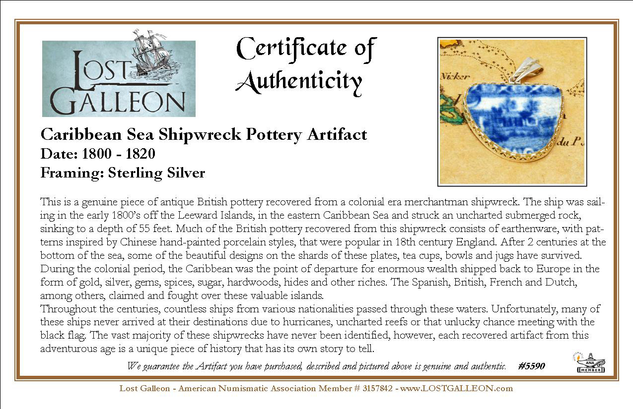 This is a genuine piece of antique British pottery recovered from a colonial era merchantman shipwreck. The ship was sailing in the early 1800’s off the Leeward Islands, in the eastern Caribbean Sea and struck an uncharted submerged rock, sinking to a depth of 55 feet. Much of the British pottery recovered from this shipwreck consists of earthenware, with patterns inspired by Chinese hand-painted porcelain styles, that were popular in 18th century England. After 2 centuries at the bottom of the sea, some of the beautiful designs on the shards of these plates, tea cups, bowls and jugs have survived.