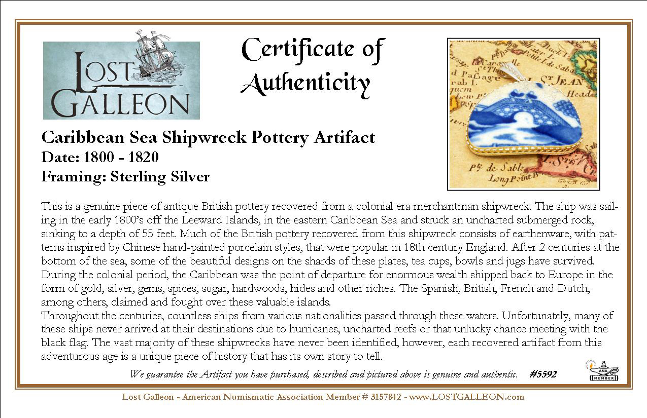 This is a genuine piece of antique British pottery recovered from a colonial era merchantman shipwreck. The ship was sailing in the early 1800’s off the Leeward Islands, in the eastern Caribbean Sea and struck an uncharted submerged rock, sinking to a depth of 55 feet. Much of the British pottery recovered from this shipwreck consists of earthenware, with patterns inspired by Chinese hand-painted porcelain styles, that were popular in 18th century England. After 2 centuries at the bottom of the sea, some of the beautiful designs on the shards of these plates, tea cups, bowls and jugs have survived.