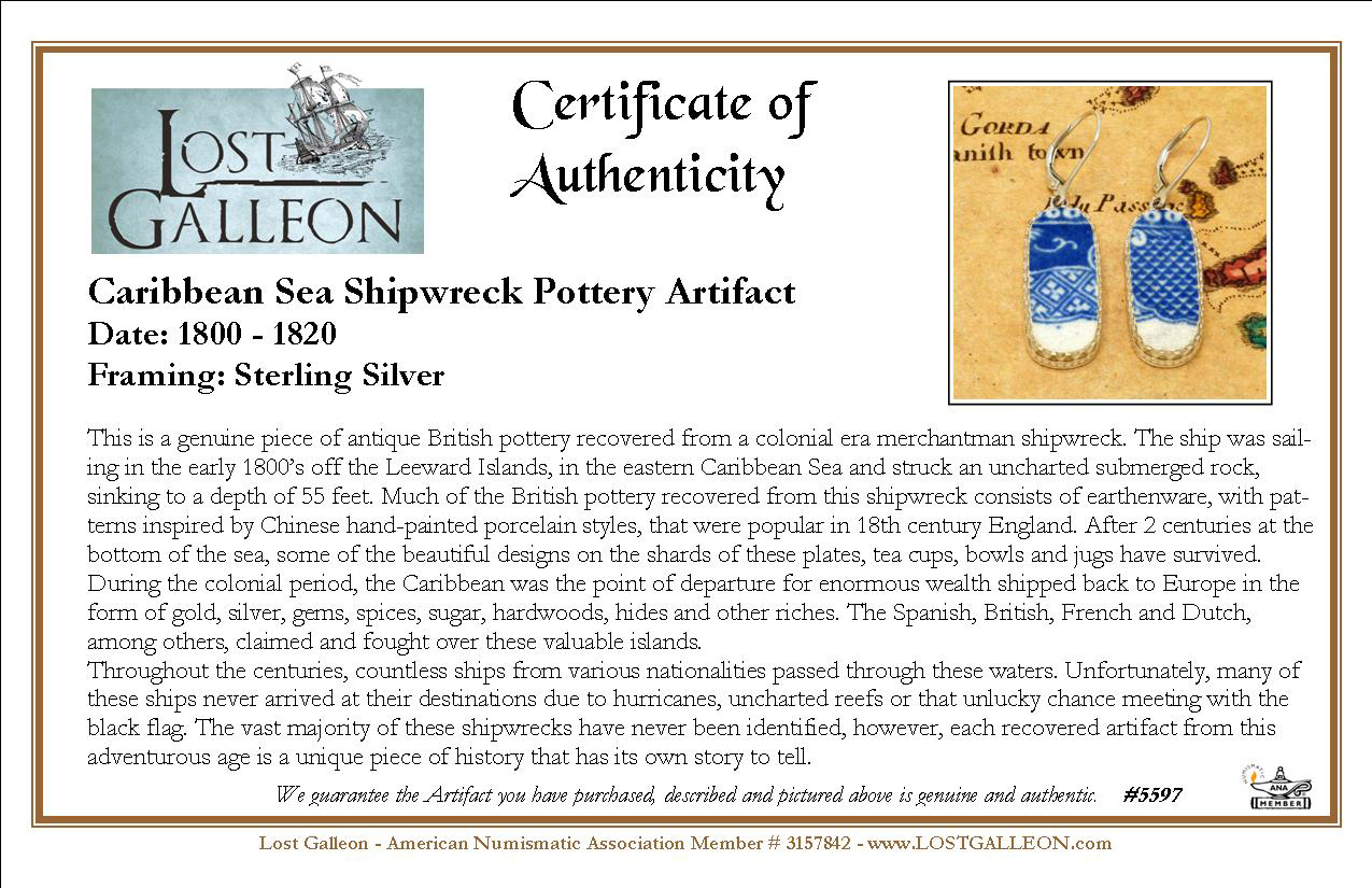 This is a genuine piece of antique British pottery recovered from a colonial era merchantman shipwreck. The ship was sailing in the early 1800’s off the Leeward Islands, in the eastern Caribbean Sea and struck an uncharted submerged rock, sinking to a depth of 55 feet. Much of the British pottery recovered from this shipwreck consists of earthenware, with patterns inspired by Chinese hand-painted porcelain styles, that were popular in 18th century England. After 2 centuries at the bottom of the sea, some of the beautiful designs on the shards of these plates, tea cups, bowls and jugs have survived.