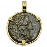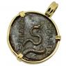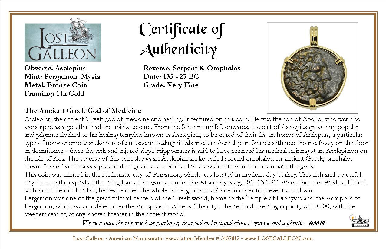 Asclepius, the ancient Greek god of medicine and healing, is featured on this coin. He was the son of Apollo, who was also worshiped as a god that had the ability to cure. From the 5th century BC onwards, the cult of Asclepius grew very popular and pilgrims flocked to his healing temples, known as Asclepieia, to be cured of their ills. In honor of Asclepius, a particular type of non-venomous snake was often used in healing rituals and the Aesculapian Snakes slithered around freely on the floor in dormitories, where the sick and injured slept. Hippocrates is said to have received his medical training at an Asclepieion on the isle of Kos. The reverse of this coin shows an Asclepian snake coiled around omphalos. In ancient Greek, omphalos means "navel" and it was a powerful religious stone believed to allow direct communication with the gods.
