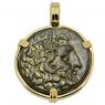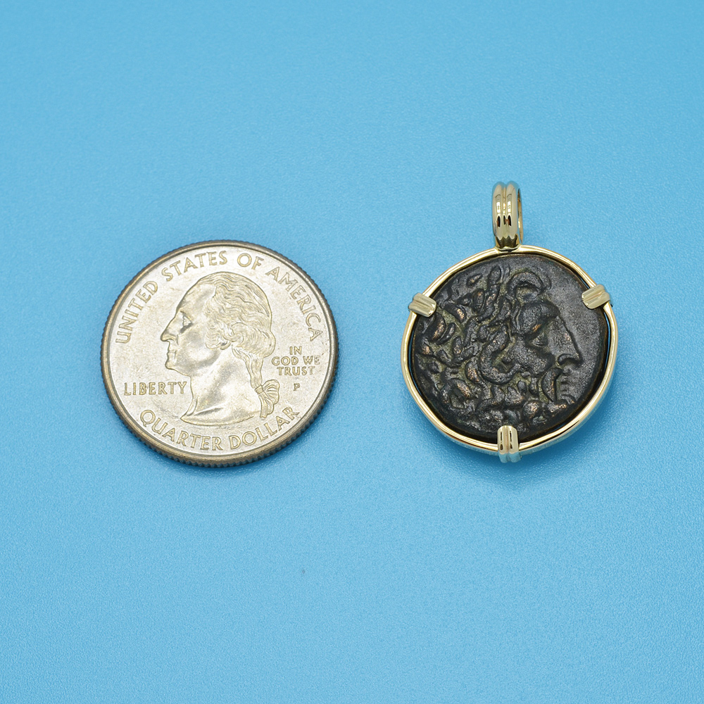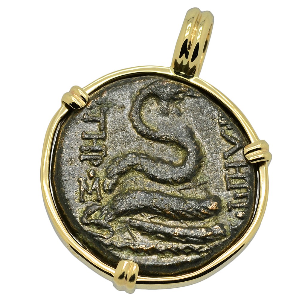Asclepius, the ancient Greek god of medicine and healing, is featured on this coin. He was the son of Apollo, who was also worshiped as a god that had the ability to cure. From the 5th century BC onwards, the cult of Asclepius grew very popular and pilgrims flocked to his healing temples, known as Asclepieia, to be cured of their ills. In honor of Asclepius, a particular type of non-venomous snake was often used in healing rituals and the Aesculapian Snakes slithered around freely on the floor in dormitories, where the sick and injured slept. Hippocrates is said to have received his medical training at an Asclepieion on the isle of Kos. The reverse of this coin shows an Asclepian snake coiled around omphalos. In ancient Greek, omphalos means "navel" and it was a powerful religious stone believed to allow direct communication with the gods.