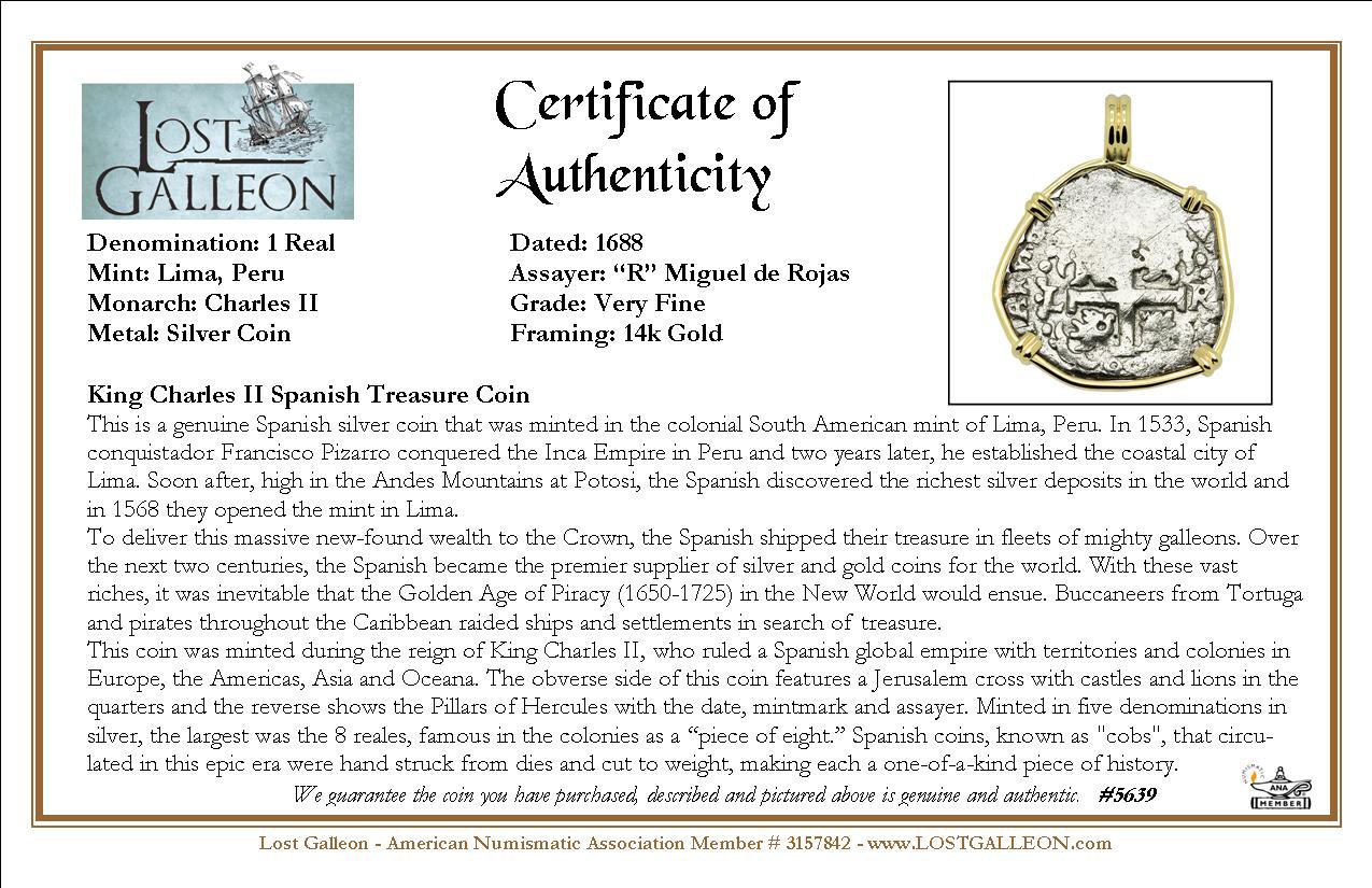 This coin was minted during the reign of King Charles II, who ruled a Spanish global empire with territories and colonies in Europe, the Americas, Asia and Oceana. The obverse side of this coin features a Jerusalem cross with castles and lions in the quarters and the reverse shows the Pillars of Hercules with the date, mintmark and assayer. Minted in five denominations in silver, the largest was the 8 reales, famous in the colonies as a “piece of eight.” Spanish coins, known as "cobs", that circulated in this epic era were hand struck from dies and cut to weight, making each a one-of-a-kind piece of history.
