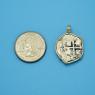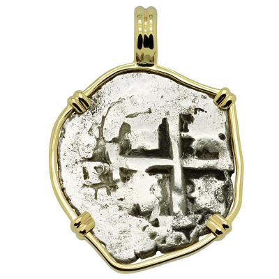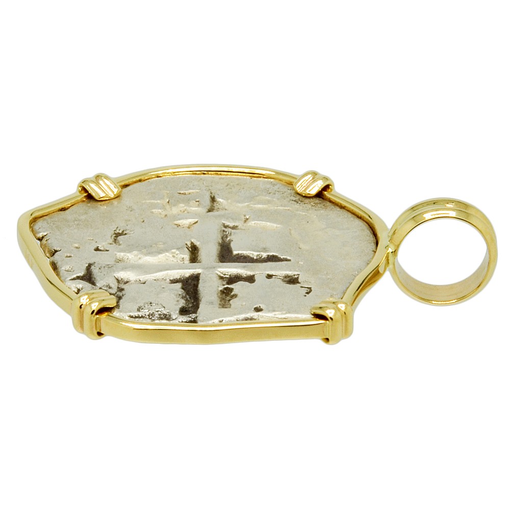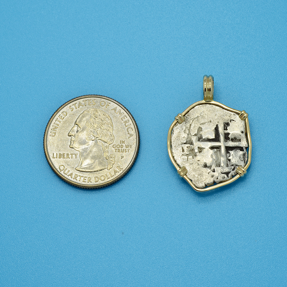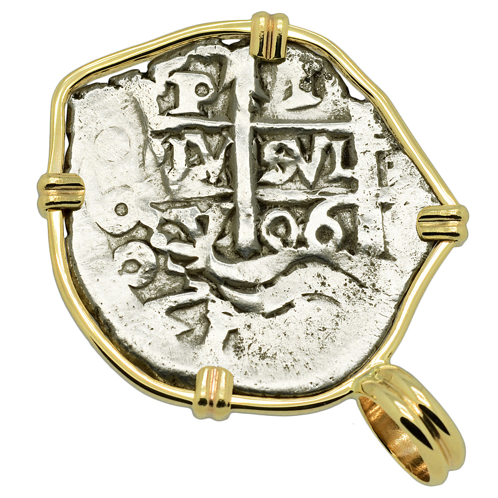 Spanish coins, known as "cobs", that circulated in this epic era were hand struck from dies and cut to weight. Minted in five denominations in silver, the largest was the 8 reales, famous in the colonies and among pirates as a “piece of eight.” The other denominations were 4 reales, 2 reales, 1 real and 1/2 real. Cob coins with their unusual shapes are all unique, making each a one-of-a-kind piece of history.