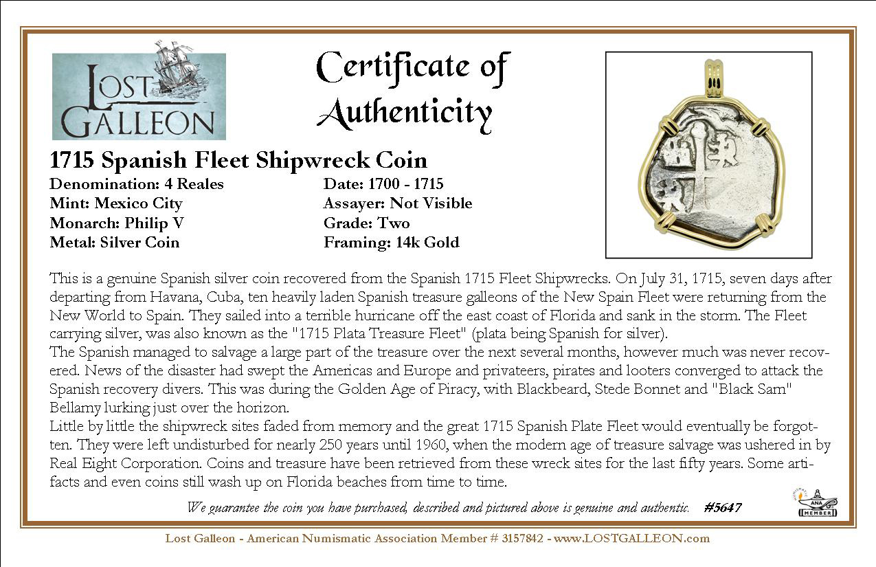 1715 Fleet shipwreck certificate also included. This is a genuine Spanish silver coin recovered from the Spanish 1715 Fleet Shipwrecks. On July 31, 1715, seven days after departing from Havana, Cuba, ten heavily laden Spanish treasure galleons of the New Spain Fleet were returning from the New World to Spain. They sailed into a terrible hurricane off the east coast of Florida and sank in the storm. The Fleet carrying silver, was also known as the "1715 Plata Treasure Fleet" (plata being Spanish for silver).