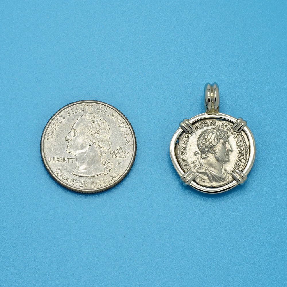 This denarius coin was minted during the rule of Hadrian, who was Roman Emperor from 117 to 138. The obverse side features the laureate head of Hadrian with the legend IMP CAESAR TRAIAN HADRIANVS AVG translated to “Emperor Caesar Trajan Hadrian Augustus.” Hadrian is best known for building Hadrian's Wall, which marked the northern limit of Roman territory in Britain. A significant portion of the wall still exists and today is the most popular tourist attraction in Northern England. In Rome, he re-built the Pantheon and almost two thousand years later, its dome is still the world's largest unreinforced concrete dome.