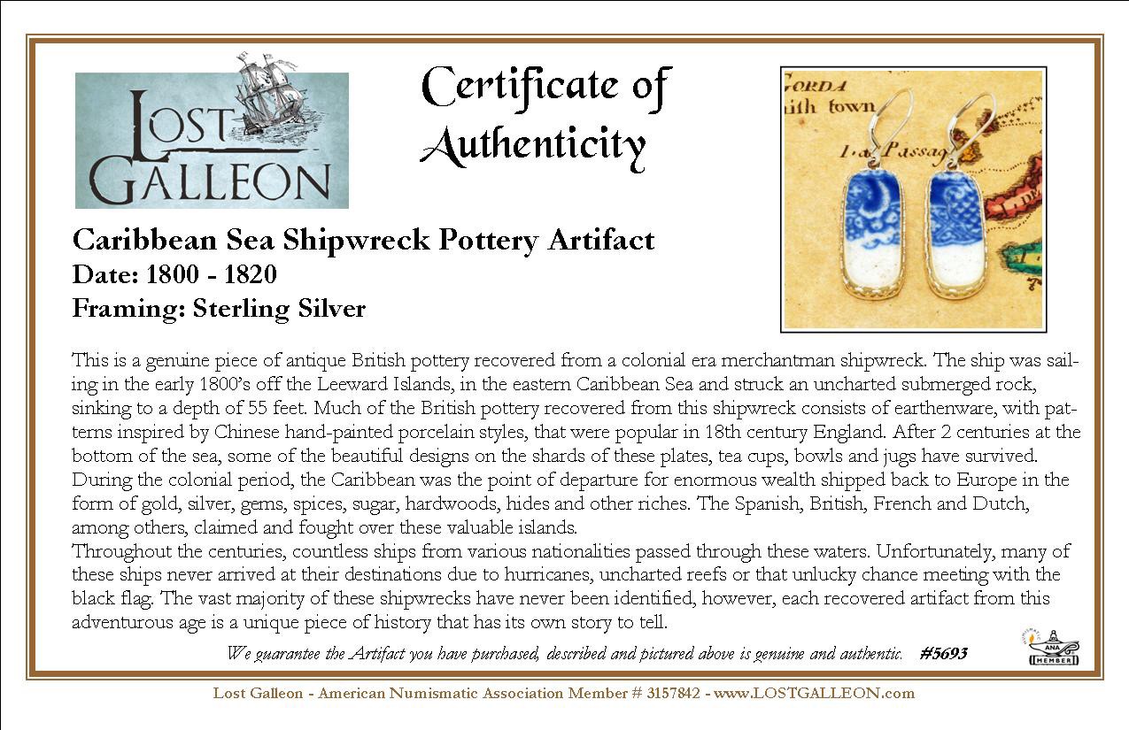 This is a genuine piece of antique British pottery recovered from a colonial era merchantman shipwreck. The ship was sailing in the early 1800’s off the Leeward Islands, in the eastern Caribbean Sea and struck an uncharted submerged rock, sinking to a depth of 55 feet. Much of the British pottery recovered from this shipwreck consists of earthenware, with patterns inspired by Chinese hand-painted porcelain styles, that were popular in 18th century England. After 2 centuries at the bottom of the sea, some of the beautiful designs on the shards of these plates, tea cups, bowls and jugs have survived.