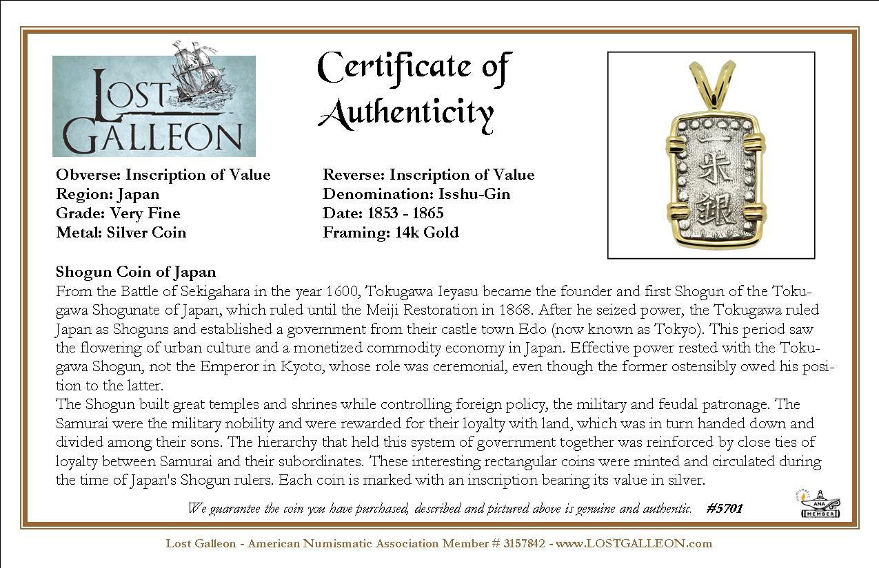 The Shogun built great temples and shrines while controlling foreign policy, the military and feudal patronage. The Samurai were the military nobility and were rewarded for their loyalty with land, which was in turn handed down and divided among their sons. The hierarchy that held this system of government together was reinforced by close ties of loyalty between Samurai and their subordinates. These interesting rectangular coins were minted and circulated during the time of Japan's Shogun rulers. Each coin is marked with an inscription bearing its value in silver.