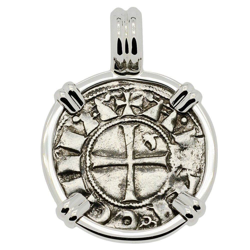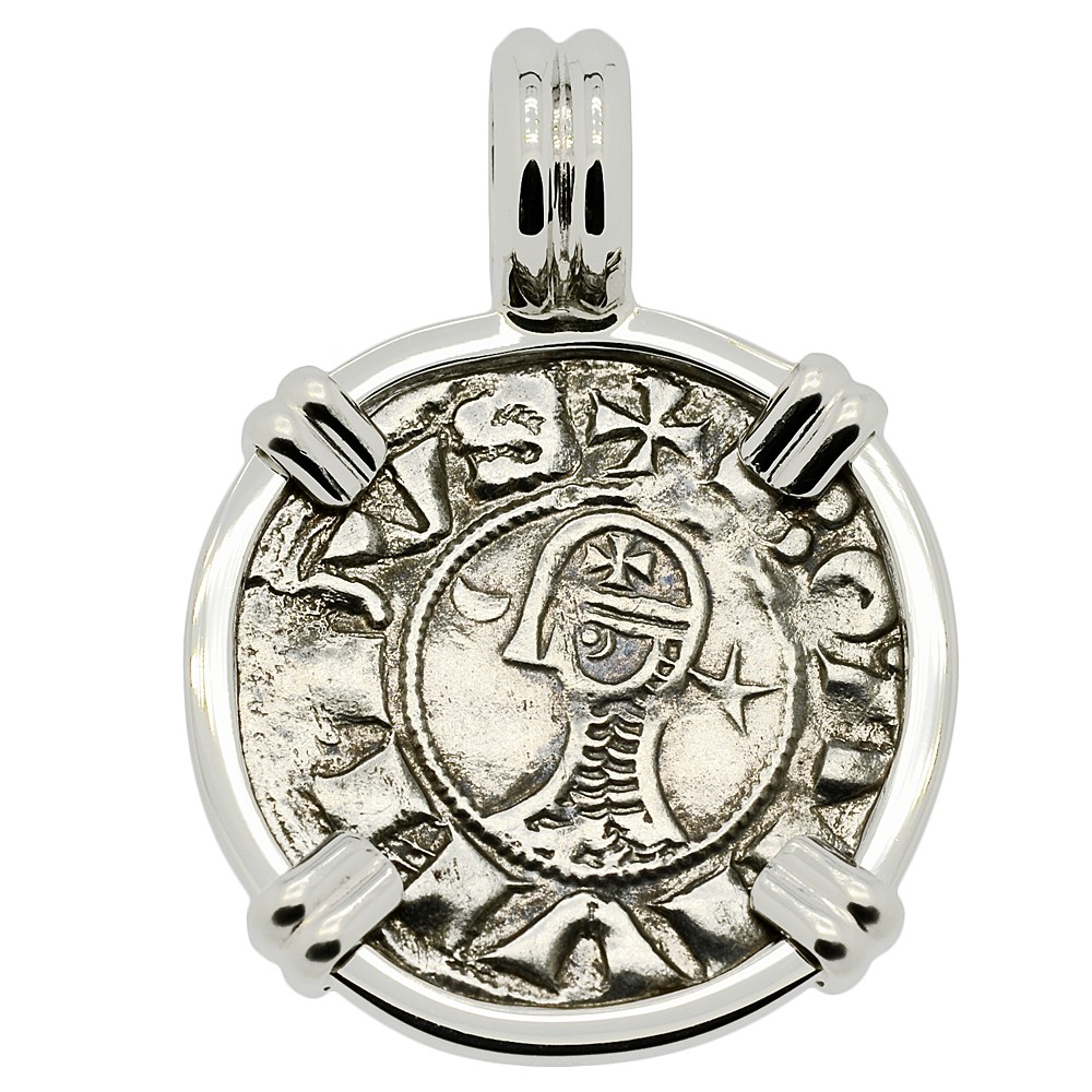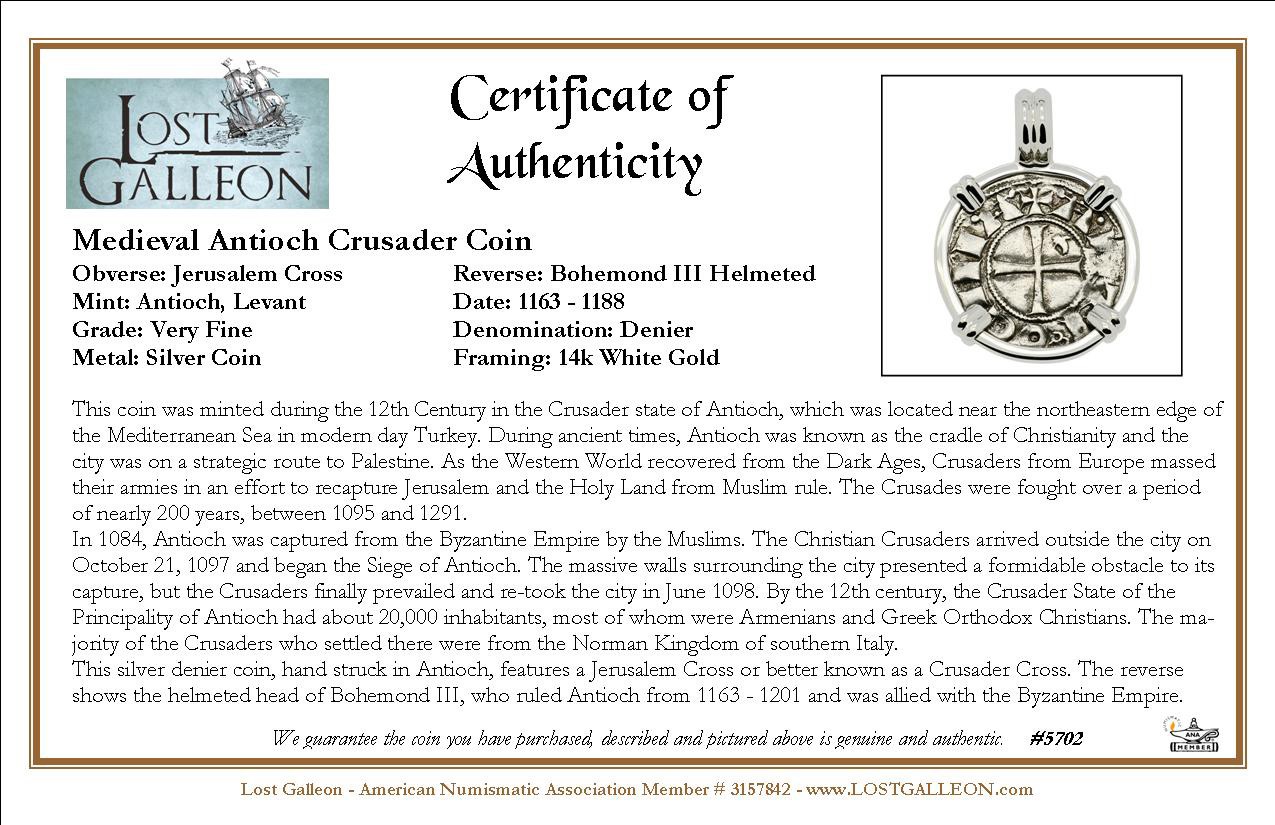 This silver denier coin, hand struck in Antioch, features the Jerusalem Cross or better known as the Crusader Cross. The reverse shows the helmeted head of Bohemond III, who ruled Antioch from 1163 - 1201 and was allied with the Byzantine Empire.
