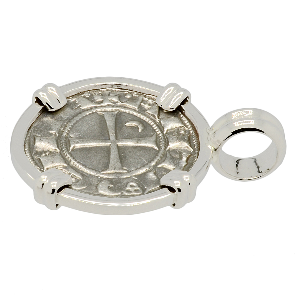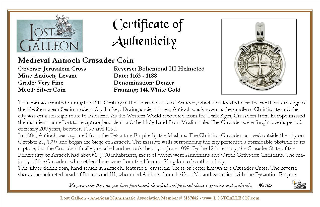 This silver denier coin, hand struck in Antioch, features the Jerusalem Cross or better known as the Crusader Cross. The reverse shows the helmeted head of Bohemond III, who ruled Antioch from 1163 - 1201 and was allied with the Byzantine Empire.