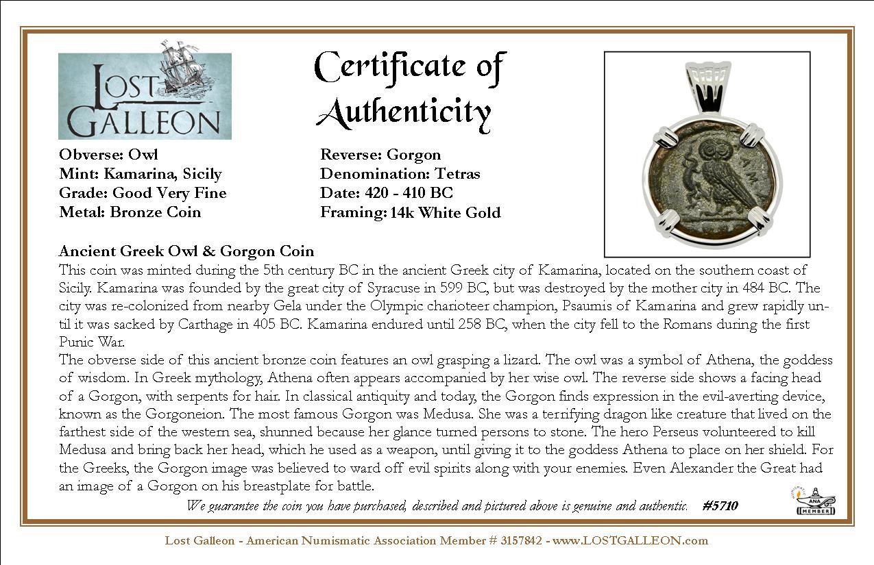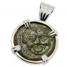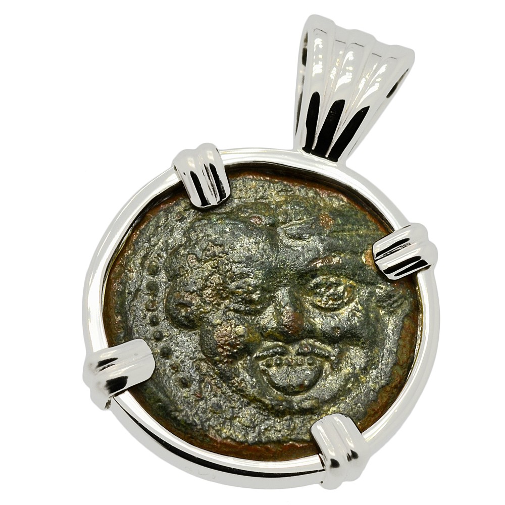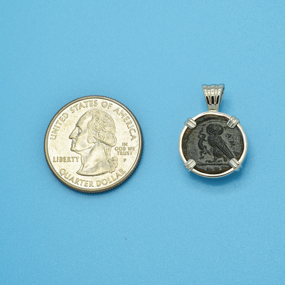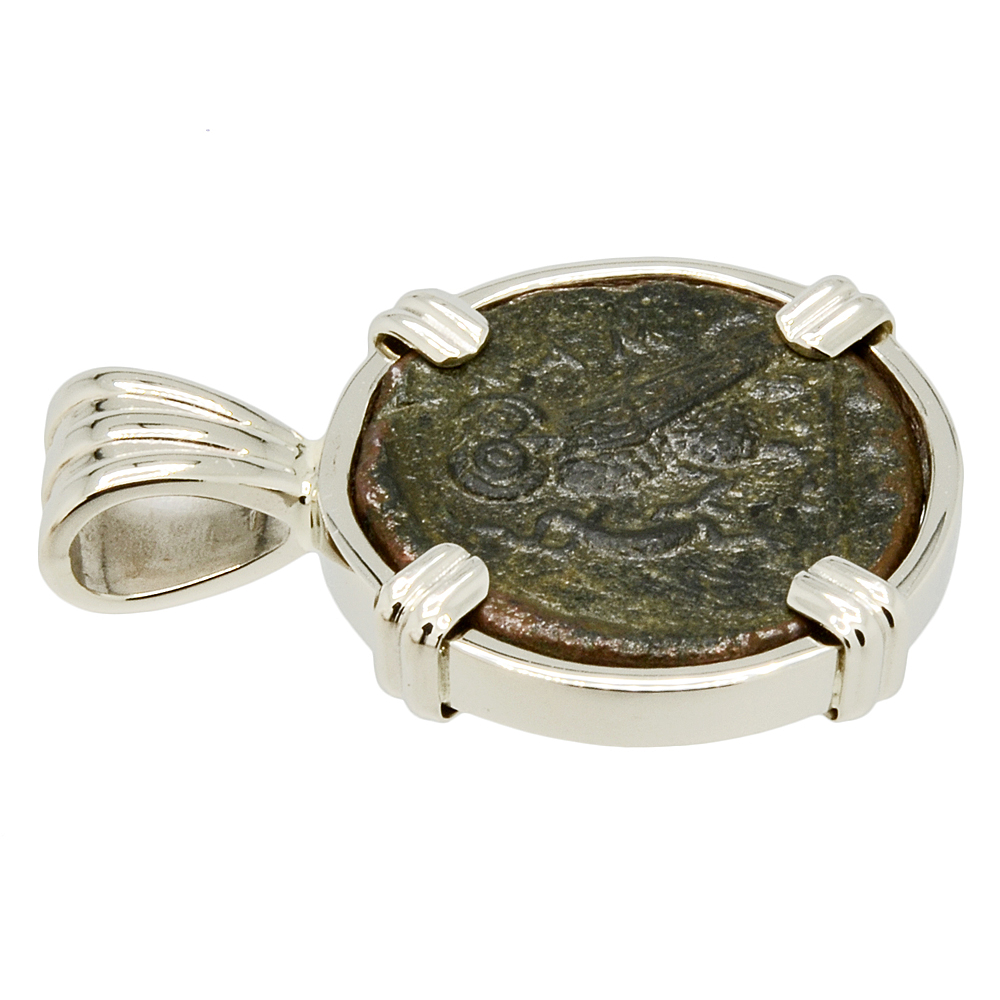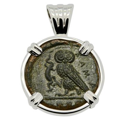 The obverse side of this ancient bronze coin features an owl grasping a lizard. The owl was a symbol of Athena, the goddess of wisdom. In Greek mythology, Athena often appears accompanied by her wise owl. The reverse side shows a facing head of a Gorgon, with serpents for hair. In classical antiquity and today, the Gorgon finds expression in the evil-averting device, known as the Gorgoneion.