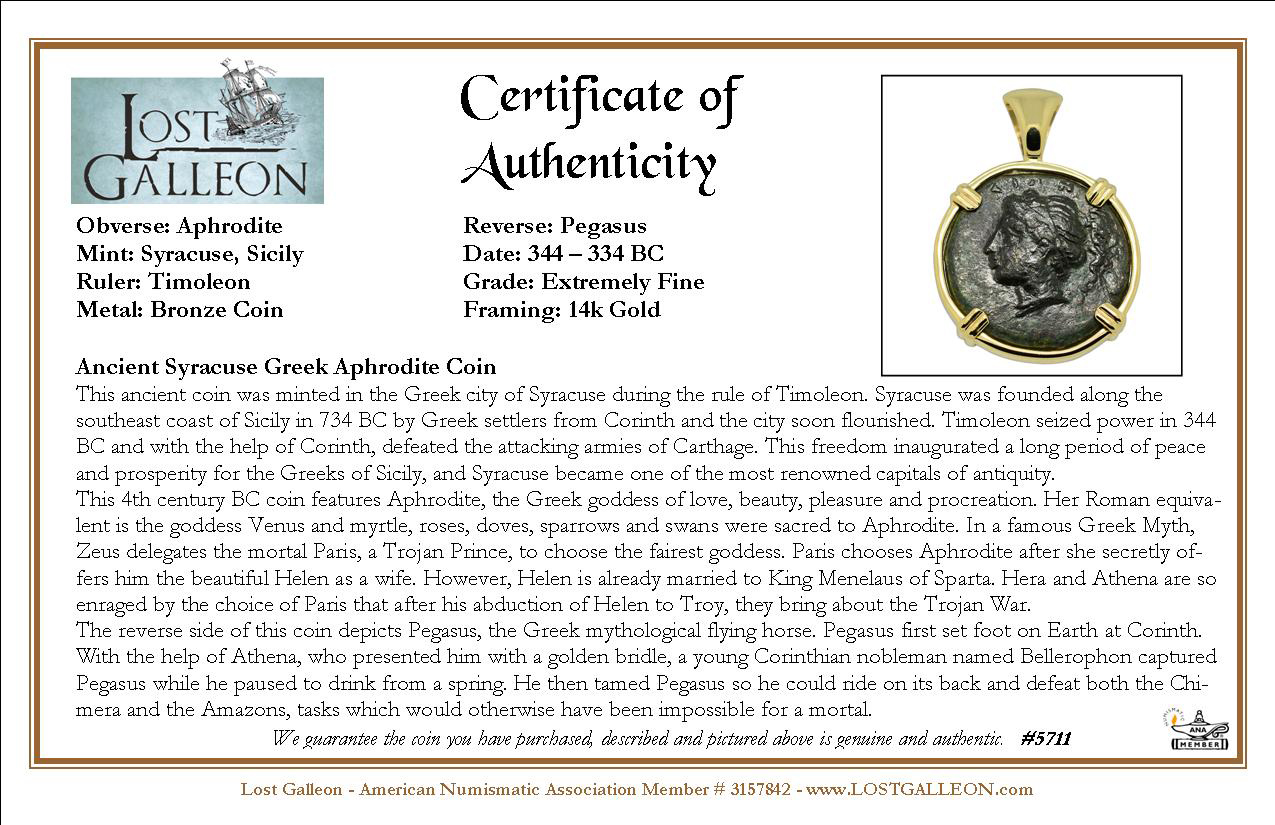 This 4th century BC coin features Aphrodite, the Greek goddess of love, beauty, pleasure and procreation. Her Roman equivalent is the goddess Venus and myrtle, roses, doves, sparrows and swans were sacred to Aphrodite. In a famous Greek Myth, Zeus delegates the mortal Paris, a Trojan Prince, to choose the fairest goddess. Paris chooses Aphrodite after she secretly offers him the beautiful Helen as a wife. However, Helen is already married to King Menelaus of Sparta. Hera and Athena are so enraged by the choice of Paris that after his abduction of Helen to Troy, they bring about the Trojan War.