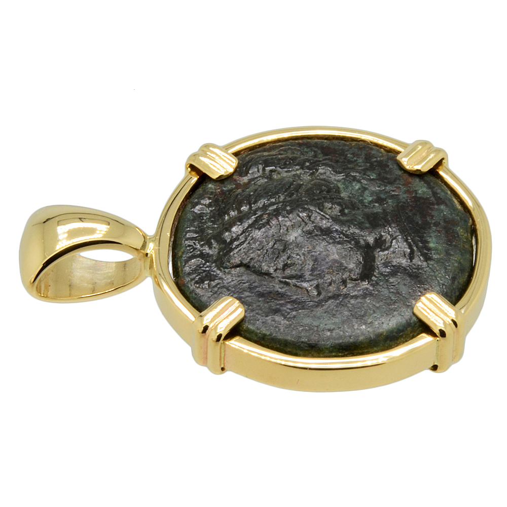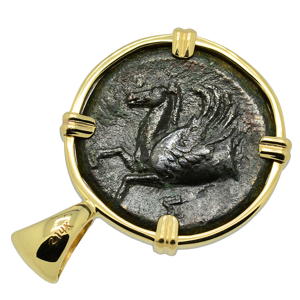 This ancient coin was minted in the Greek city of Syracuse during the rule of Timoleon. Syracuse was founded along the southeast coast of Sicily in 734 BC by Greek settlers from Corinth and the city soon flourished. Timoleon seized power in 344 BC and with the help of Corinth, defeated the attacking armies of Carthage. This freedom inaugurated a long period of peace and prosperity for the Greeks of Sicily, and Syracuse became one of the most renowned capitals of antiquity.