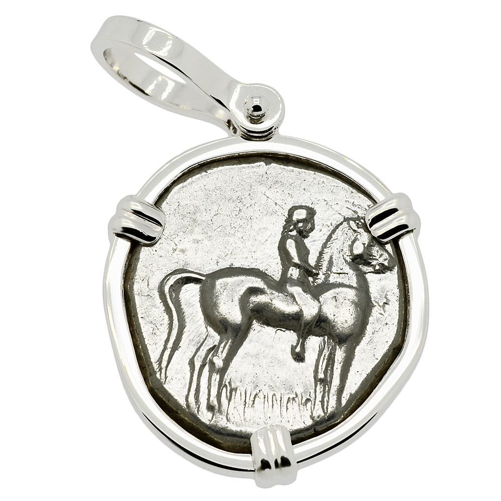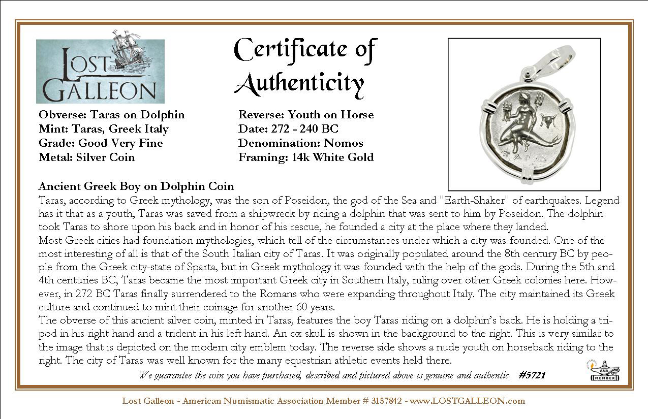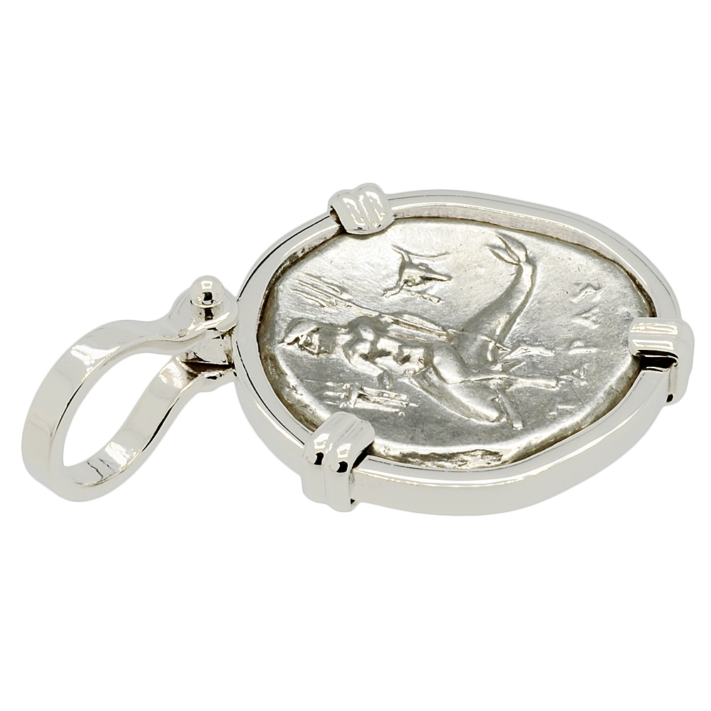 The obverse of this ancient silver coin, minted in Taras, features the boy Taras riding on a dolphin’s back. He is holding a tripod in his right hand and a trident in his left hand. An ox skull is shown in the background to the right. This is very similar to the image that is depicted on the modern city emblem today. The reverse side shows a nude youth on horseback riding to the right. The city of Taras was well known for the many equestrian athletic events held there.