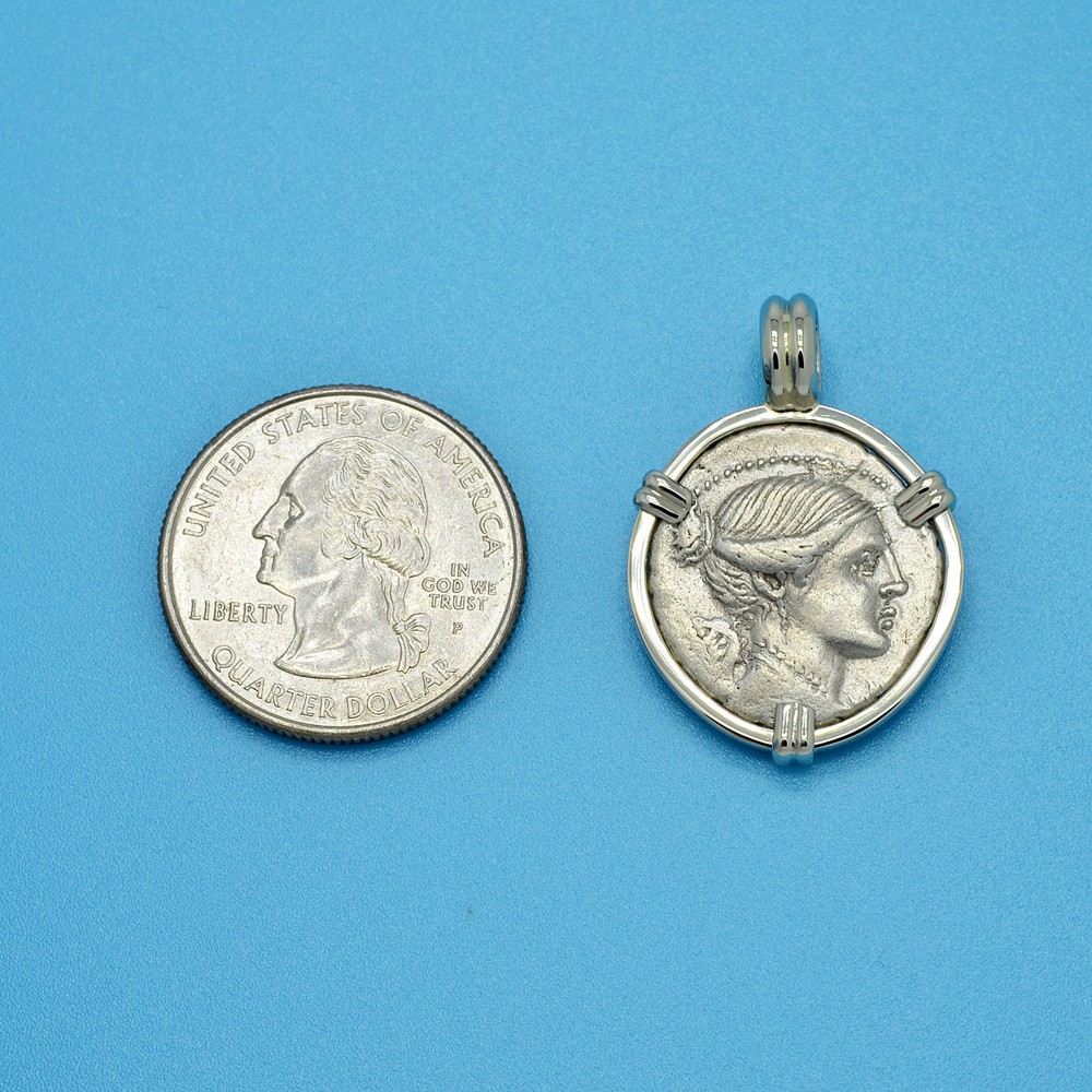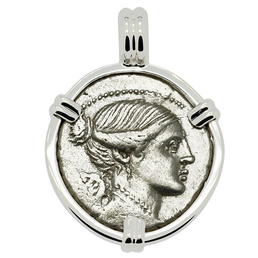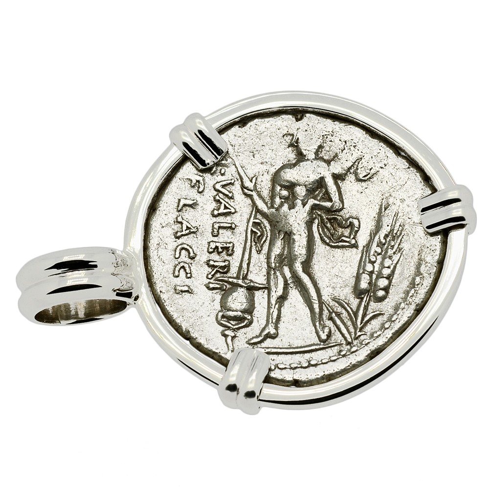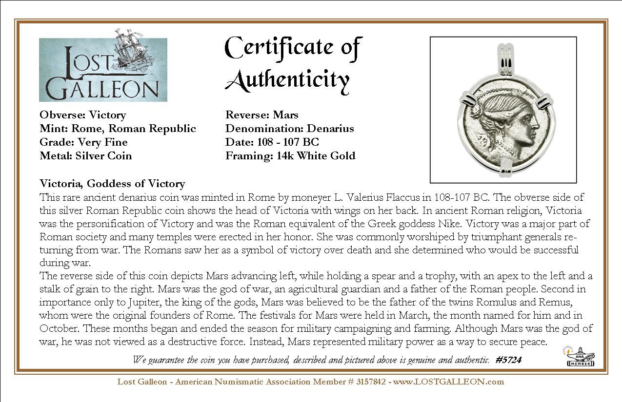 This rare ancient denarius coin was minted in Rome by moneyer L. Valerius Flaccus in 108-107 BC. The obverse side of this silver Roman Republic coin shows the head of Victoria with wings on her back. In ancient Roman religion, Victoria was the personification of Victory and was the Roman equivalent of the Greek goddess Nike. Victory was a major part of Roman society and many temples were erected in her honor. She was commonly worshiped by triumphant generals returning from war. The Romans saw her as a symbol of victory over death and she determined who would be successful during war.