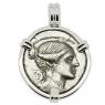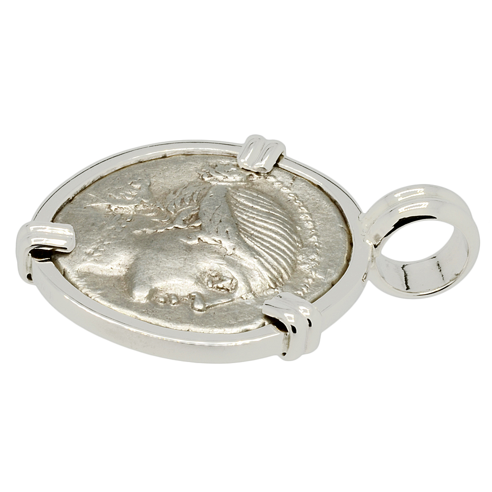 The reverse side of this coin depicts Mars advancing left, while holding a spear and a trophy, with an apex to the left and a stalk of grain to the right. Mars was the god of war, an agricultural guardian and a father of the Roman people. Second in importance only to Jupiter, the king of the gods, Mars was believed to be the father of the twins Romulus and Remus, whom were the original founders of Rome. The festivals for Mars were held in March, the month named for him and in October. These months began and ended the season for military campaigning and farming. Although Mars was the god of war, he was not viewed as a destructive force. Instead, Mars represented military power as a way to secure peace.