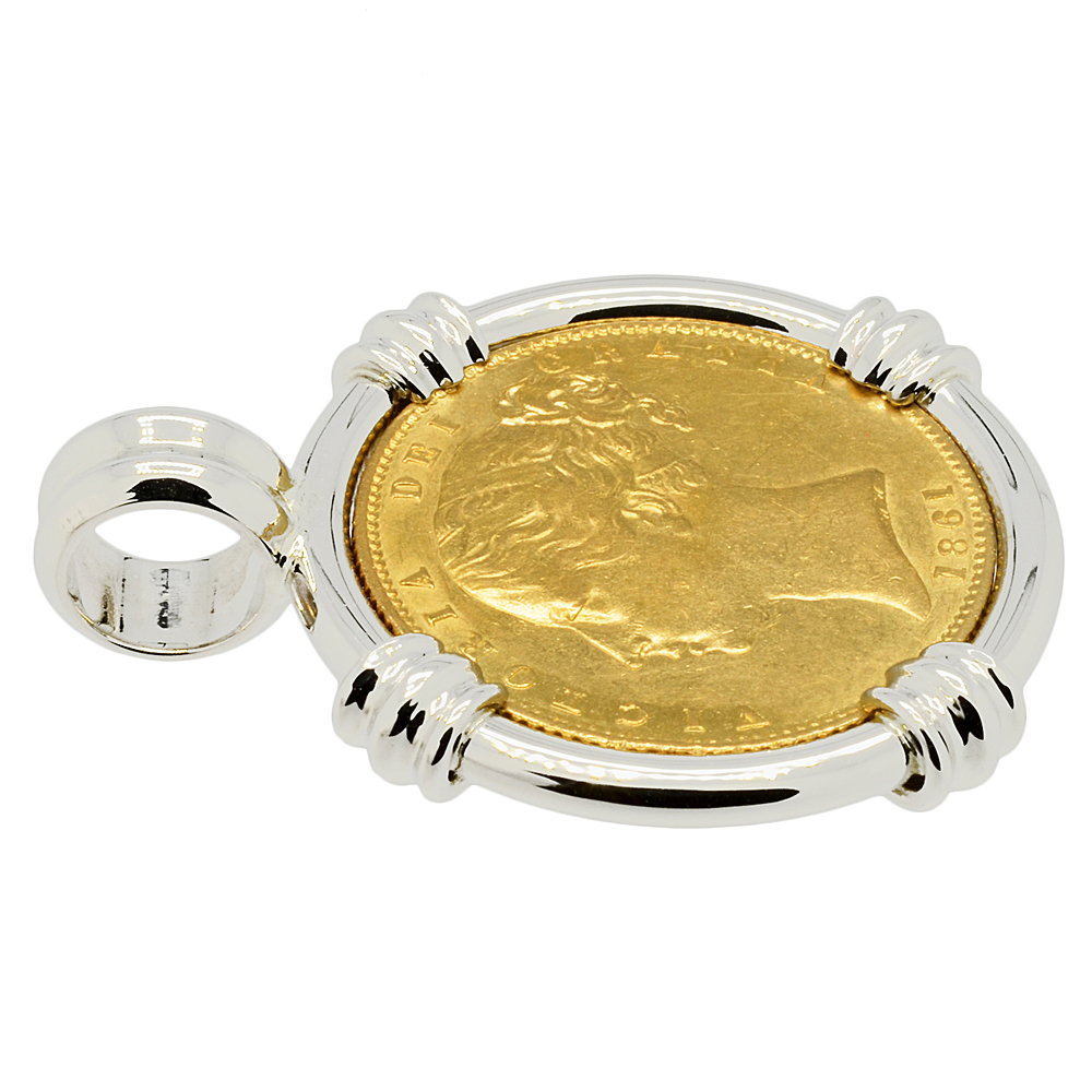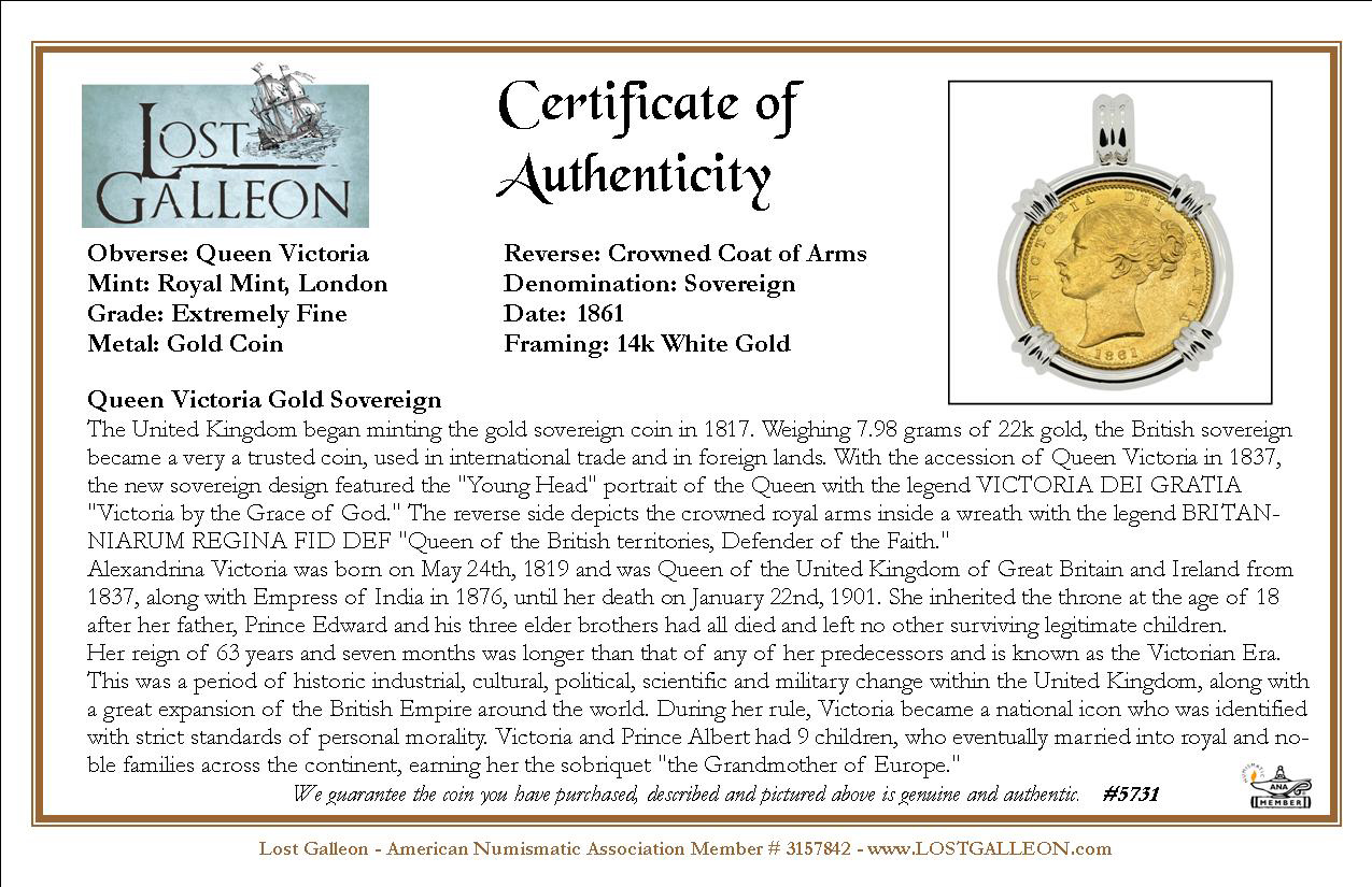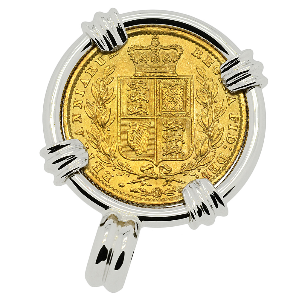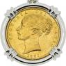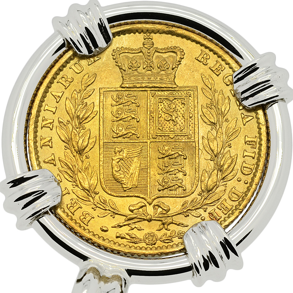 The United Kingdom began minting the gold sovereign coin in 1817. Weighing 7.98 grams of 22k gold, the British sovereign became a very a trusted coin, used in international trade and in foreign lands. With the accession of Queen Victoria in 1837, the new sovereign design featured the "Young Head" portrait of the Queen with the legend VICTORIA DEI GRATIA "Victoria by the Grace of God." The reverse side depicts the crowned royal arms inside a wreath with the legend BRITANNIARUM REGINA FID DEF "Queen of the British territories, Defender of the Faith."