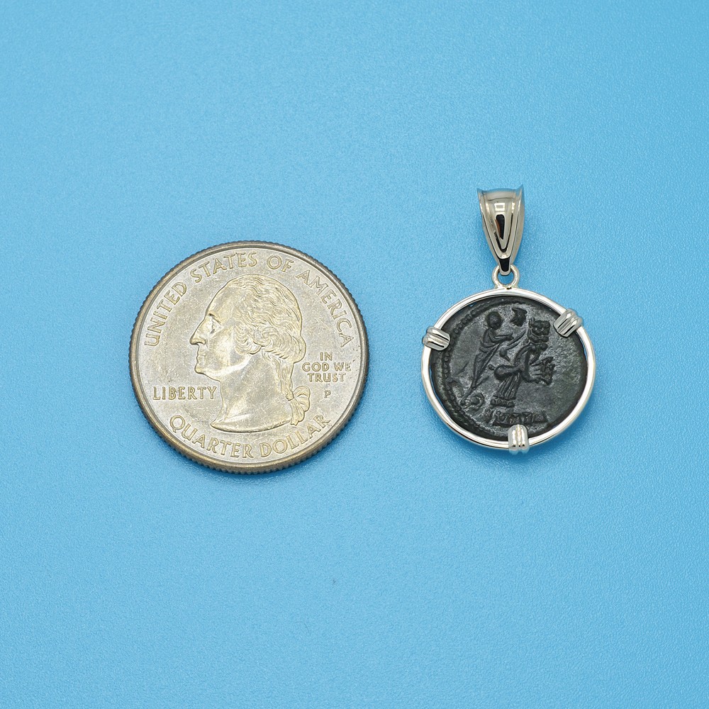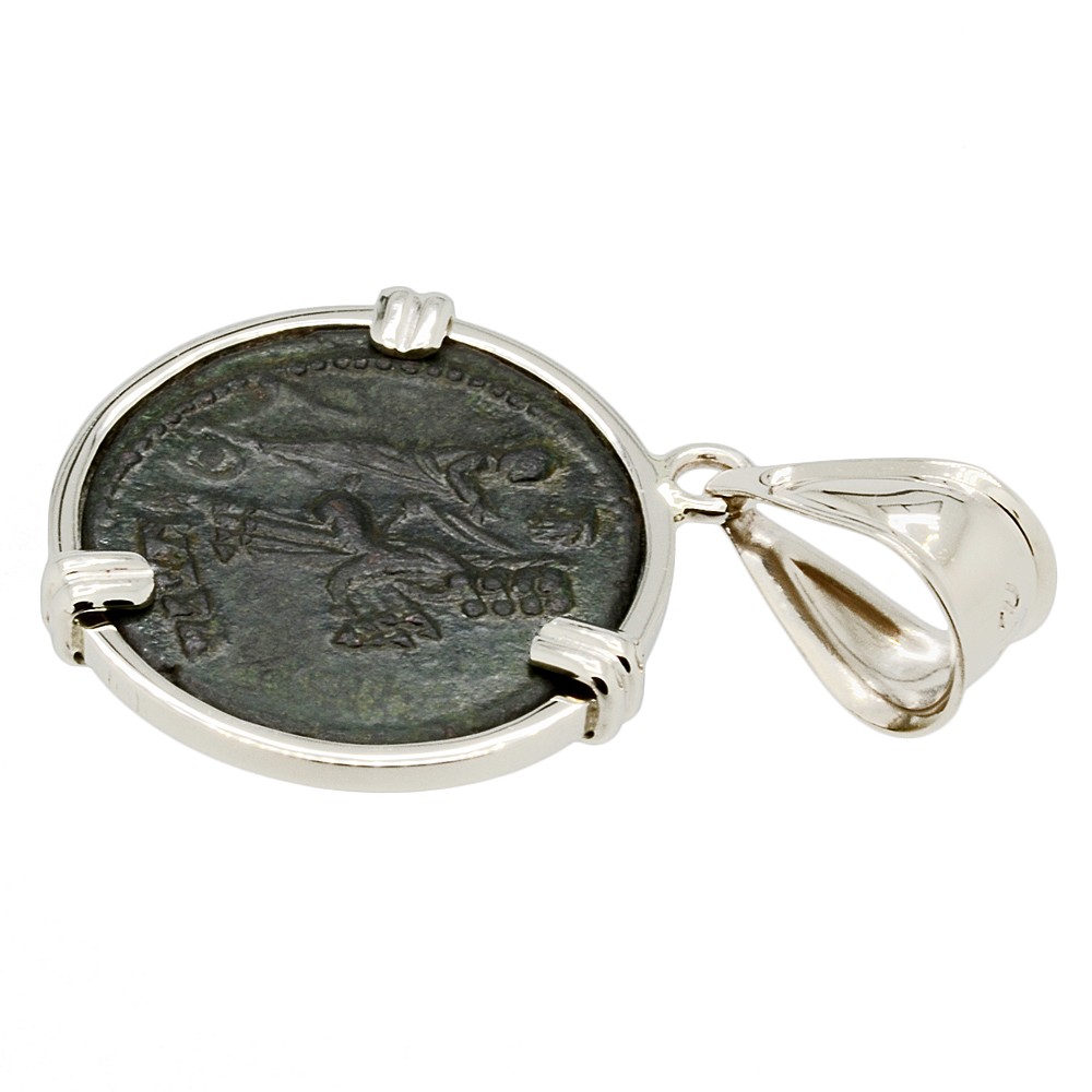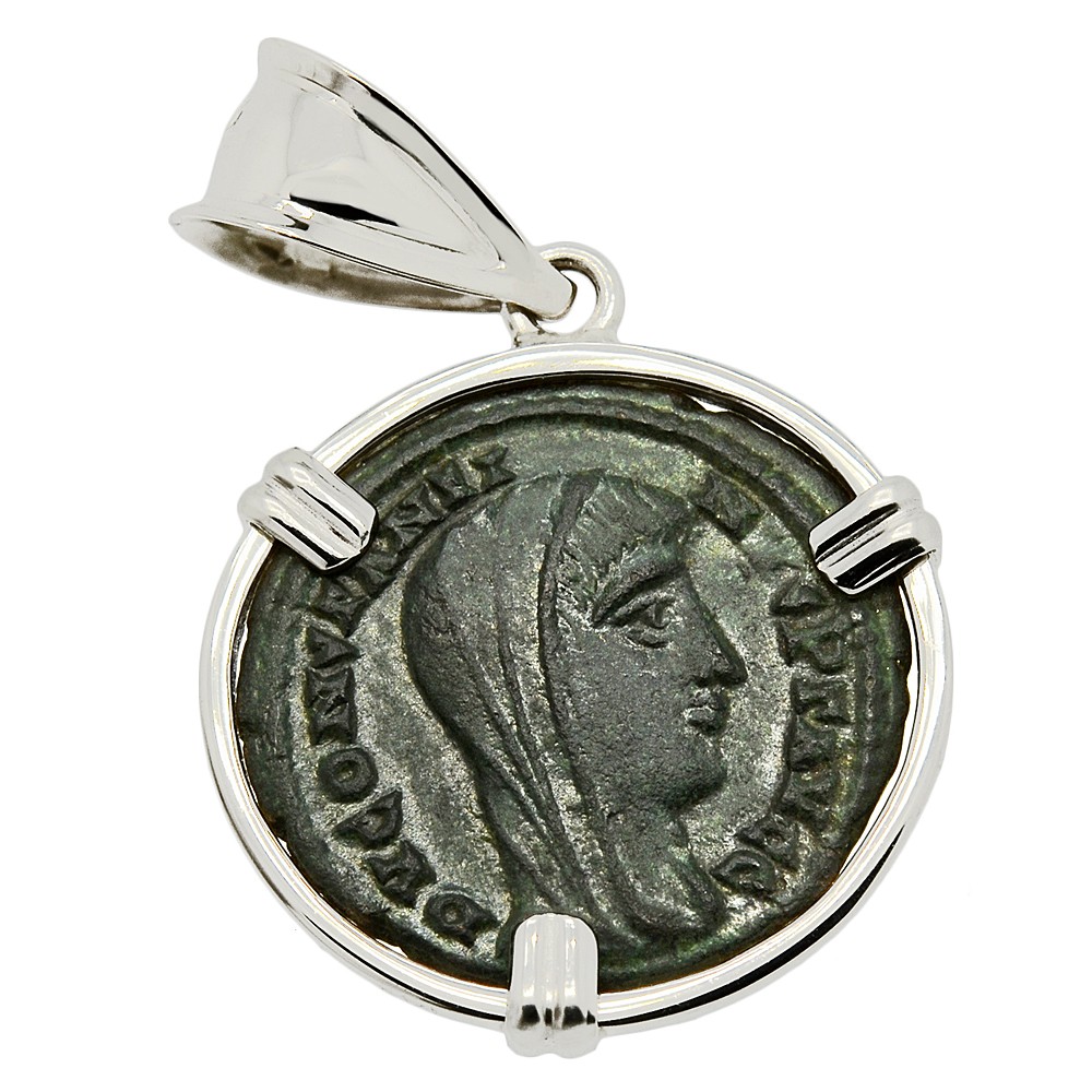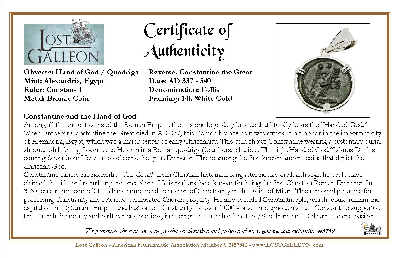 Among all the ancient coins of the Roman Empire, there is one legendary bronze that literally bears the “Hand of God.” When Emperor Constantine the Great died in AD 337, this Roman bronze coin was struck in his honor in the important city of Alexandria, Egypt, which was a major center of early Christianity. This coin shows Constantine wearing a customary burial shroud, while being flown up to Heaven in a Roman quadriga (four horse chariot). The right Hand of God “Manus Dei” is coming down from Heaven to welcome the great Emperor. This is among the first known ancient coins that depict the Christian God.