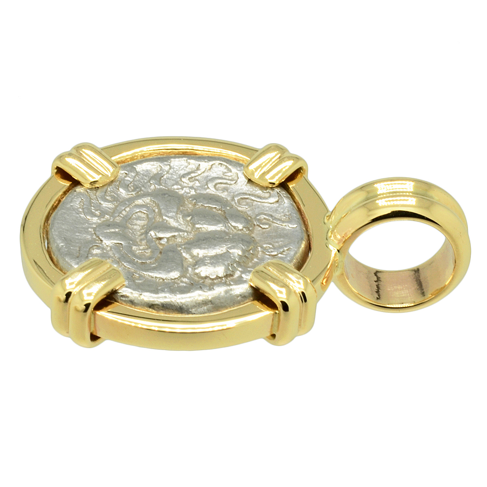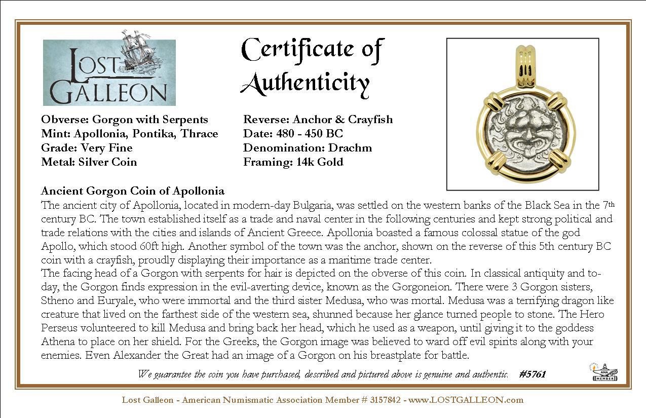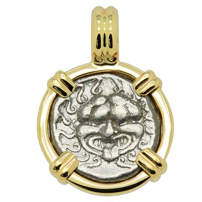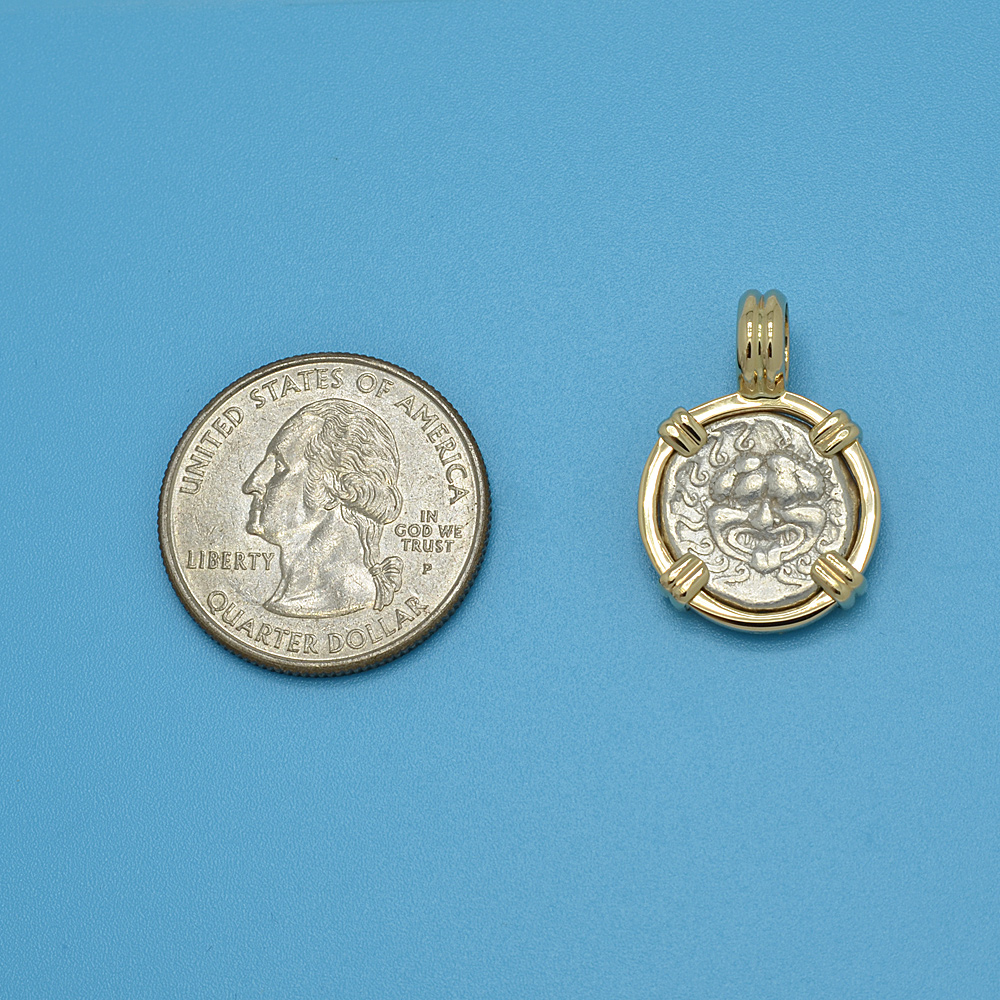 The facing head of a Gorgon with serpents for hair is depicted on the obverse of this coin. In classical antiquity and today, the Gorgon finds expression in the evil-averting device, known as the Gorgoneion. There were 3 Gorgon sisters, Stheno and Euryale, who were immortal and the third sister Medusa, who was mortal. Medusa was a terrifying dragon like creature that lived on the farthest side of the western sea, shunned because her glance turned people to stone. The Hero Perseus volunteered to kill Medusa and bring back her head, which he used as a weapon, until giving it to the goddess Athena to place on her shield. For the Greeks, the Gorgon image was believed to ward off evil spirits along with your enemies. Even Alexander the Great had an image of a Gorgon on his breastplate for battle.