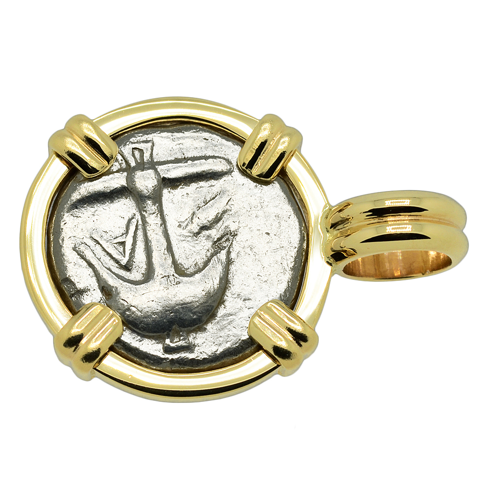 The ancient city of Apollonia, located in modern-day Bulgaria, was settled on the western banks of the Black Sea in the 7th century BC. The town established itself as a trade and naval center in the following centuries and kept strong political and trade relations with the cities and islands of Ancient Greece. Apollonia boasted a famous colossal statue of the god Apollo, which stood 60ft high. Another symbol of the town was the anchor, shown on the reverse of this 5th century BC coin with a crayfish, proudly displaying their importance as a maritime trade center.