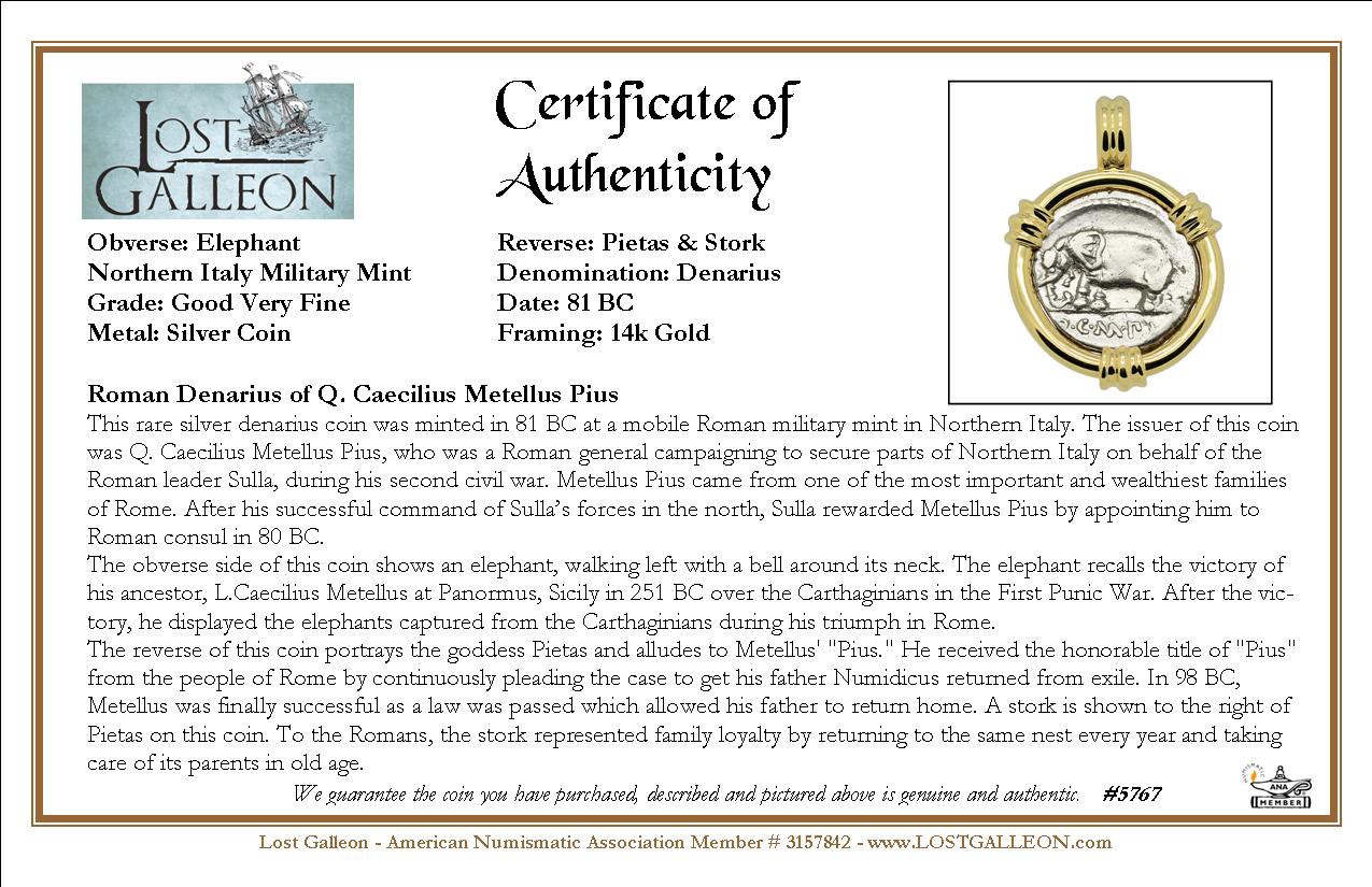 This rare silver denarius coin was minted in 81 BC at a mobile Roman military mint in Northern Italy. The issuer of this coin was Q. Caecilius Metellus Pius, who was a Roman general campaigning to secure parts of Northern Italy on behalf of the Roman leader Sulla, during his second civil war. Metellus Pius came from one of the most important and wealthiest families of Rome. After his successful command of Sulla’s forces in the north, Sulla rewarded Metellus Pius by appointing him to Roman consul in 80 BC.