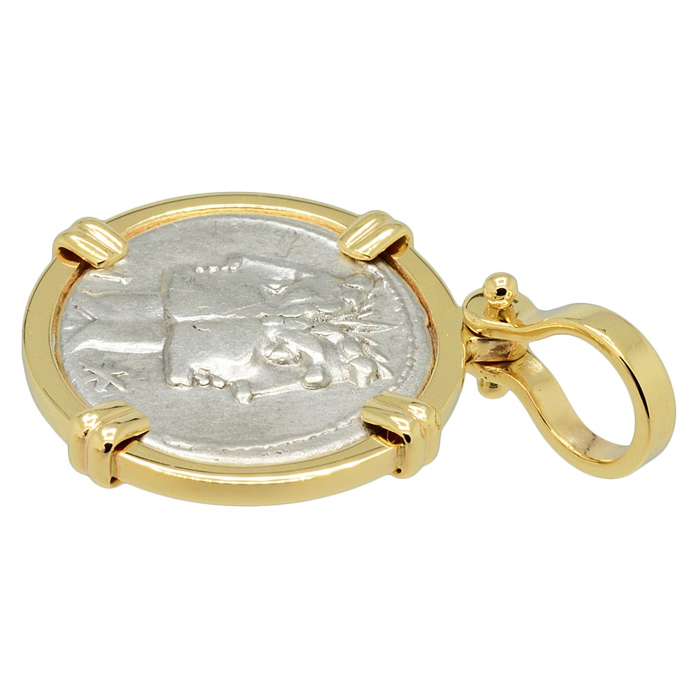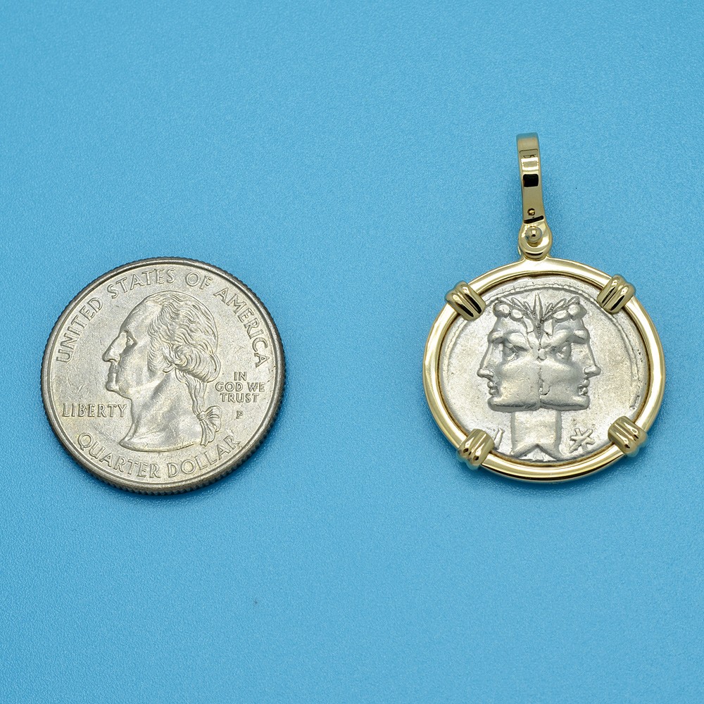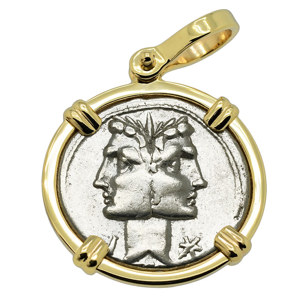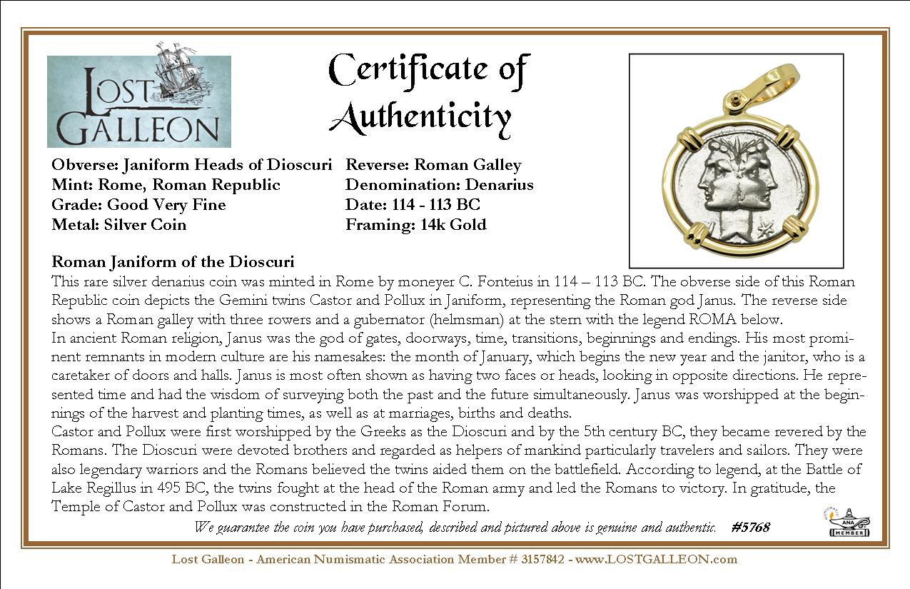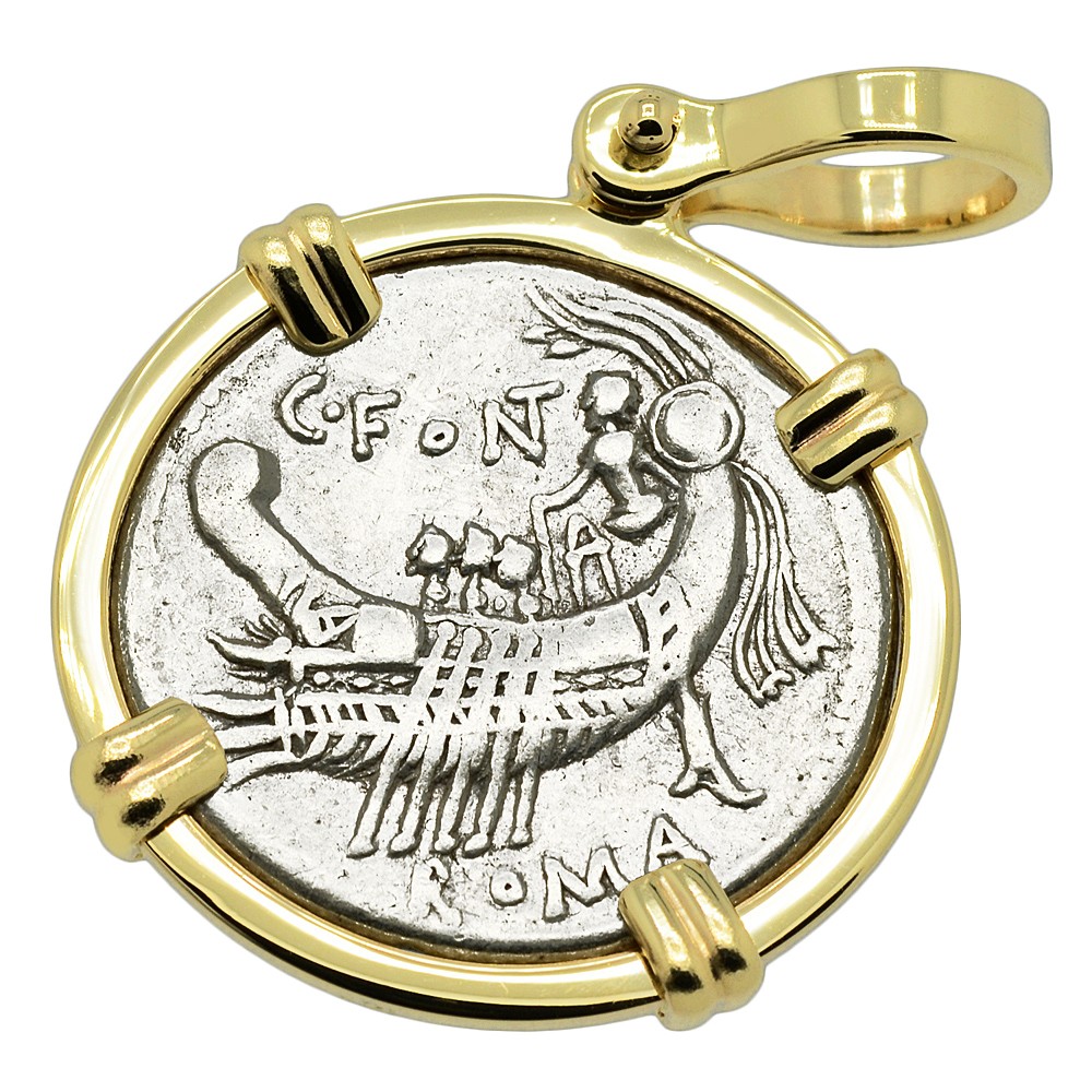 This rare silver denarius coin was minted in Rome by moneyer C. Fonteius in 114 – 113 BC. The obverse side of this Roman Republic coin depicts the Gemini twins Castor and Pollux in Janiform, representing the Roman god Janus. The reverse side shows a Roman galley with three rowers and a gubernator (helmsman) at the stern with the legend ROMA below.