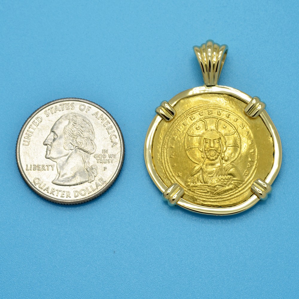 This gold coin was minted during the rule of Constantine IX, who was emperor from 1042-1055. It was during the rule of Constantine in 1054, that the centuries old disagreements finally separated the Roman Catholic and Eastern Orthodox Churches. The Byzantines however, endured for another four centuries and Christianity flourished under their protection.