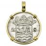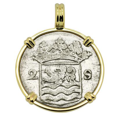 This is a genuine Dutch 2 stuivers coin that was minted in the Netherlands in 1730. The obverse features a crowned shield with a rampant lion and the reverse shows a castle with two stars, the 1730 date and the mint name ZEELANDIA. Zeeland is the westernmost province of the Netherlands and large parts of Zeeland are below sea level. The region has a history of great flooding and the coat of arms of Zeeland depicts a lion half-emerged from water.