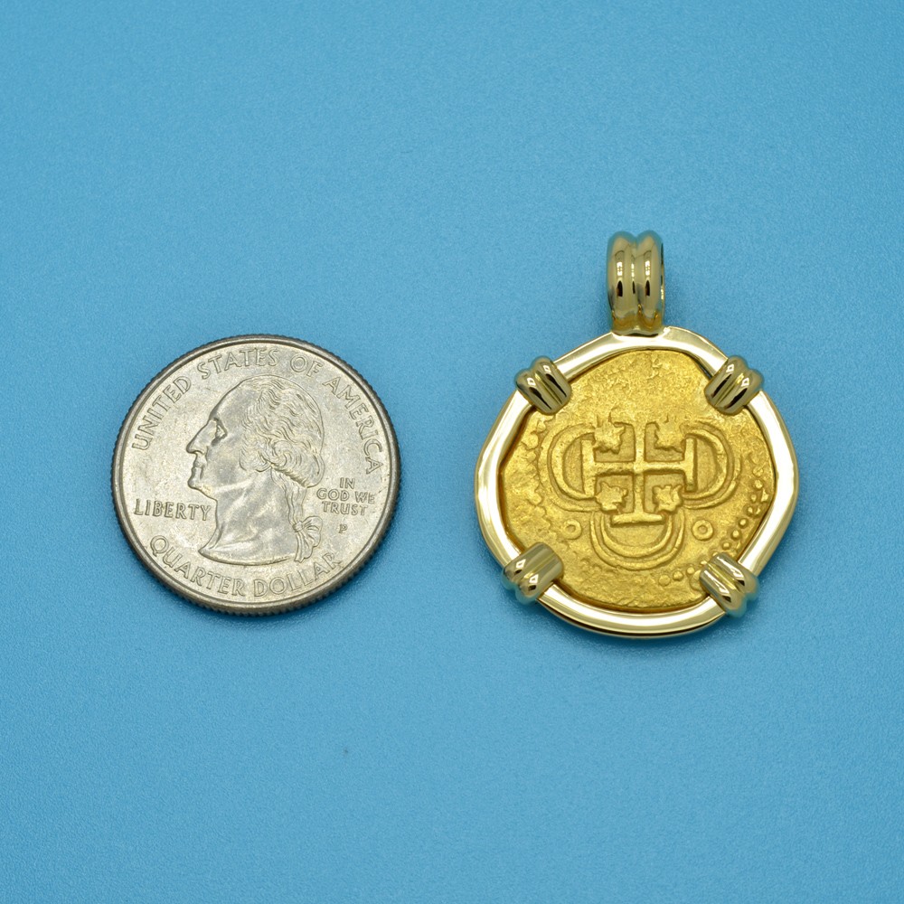 Spanish gold coins of this historical period were decreed by the King to be 22 karats and were hand struck from dies and cut to weight. Minted in five denominations, the largest was the eight escudos, however the two escudos was famous in the colonies and among pirates as a "doubloon.” A common working man at this time would have to work four months to earn a single doubloon.