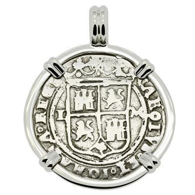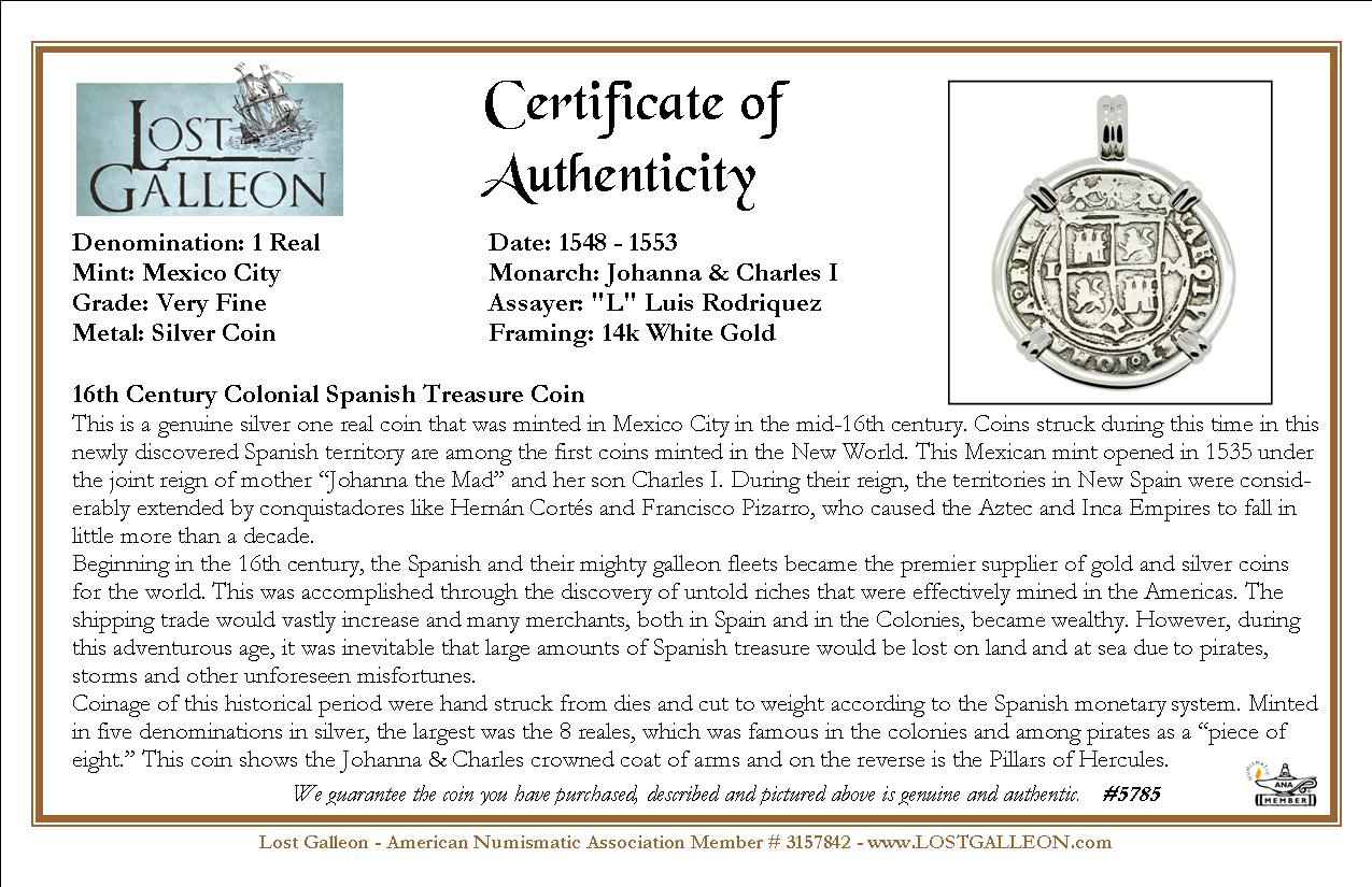 This is a genuine silver one real coin that was minted in Mexico City in the mid-16th century. Coins struck during this time in this newly discovered Spanish territory are among the first coins minted in the New World. This Mexican mint opened in 1535 under the joint reign of mother “Johanna the Mad” and her son Charles I. During their reign, the territories in New Spain were considerably extended by conquistadores like Hernán Cortés and Francisco Pizarro, who caused the Aztec and Inca Empires to fall in little more than a decade.