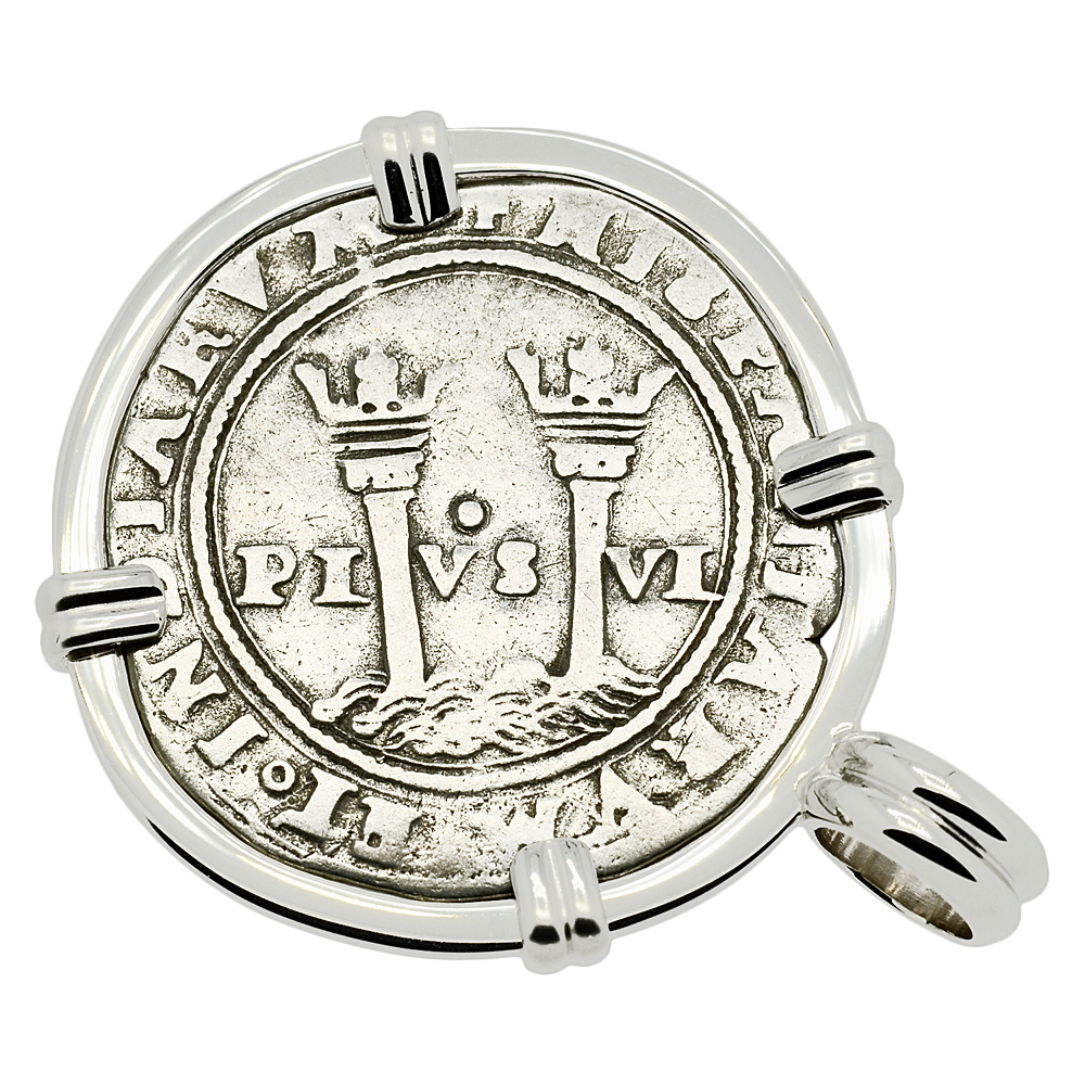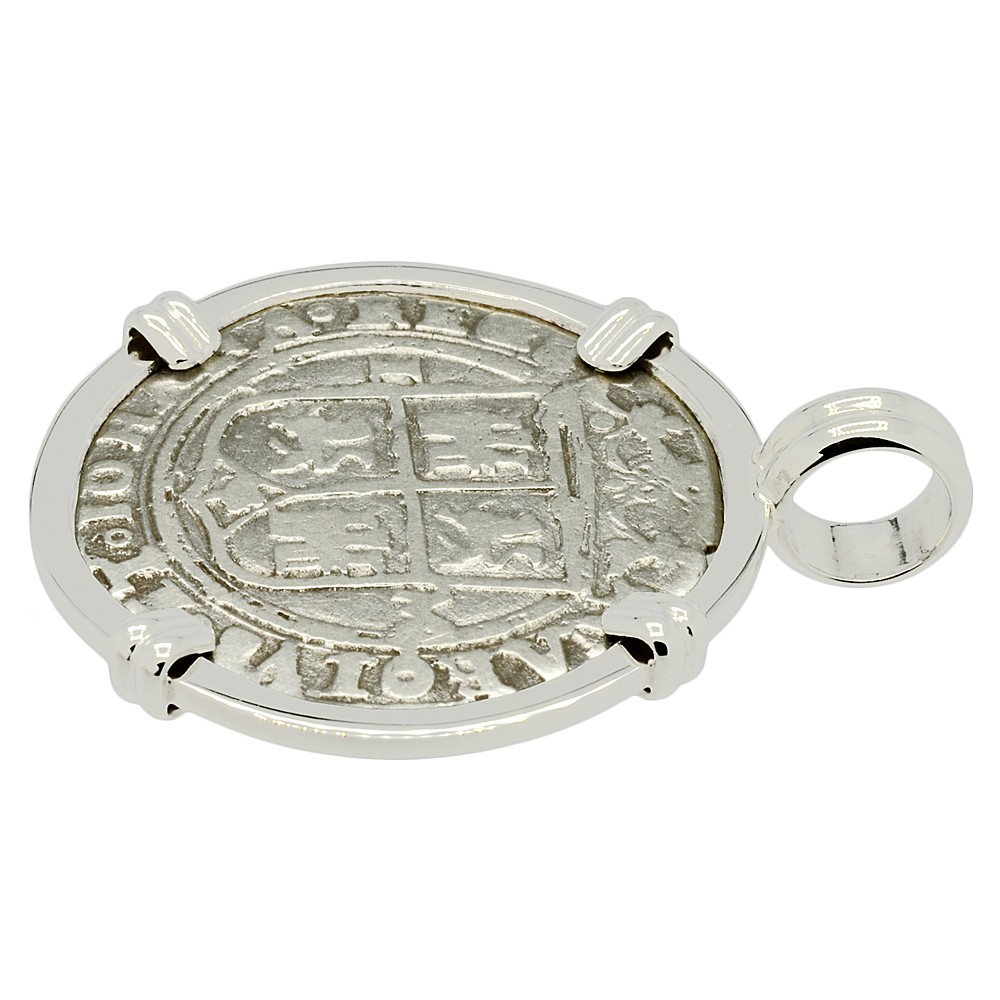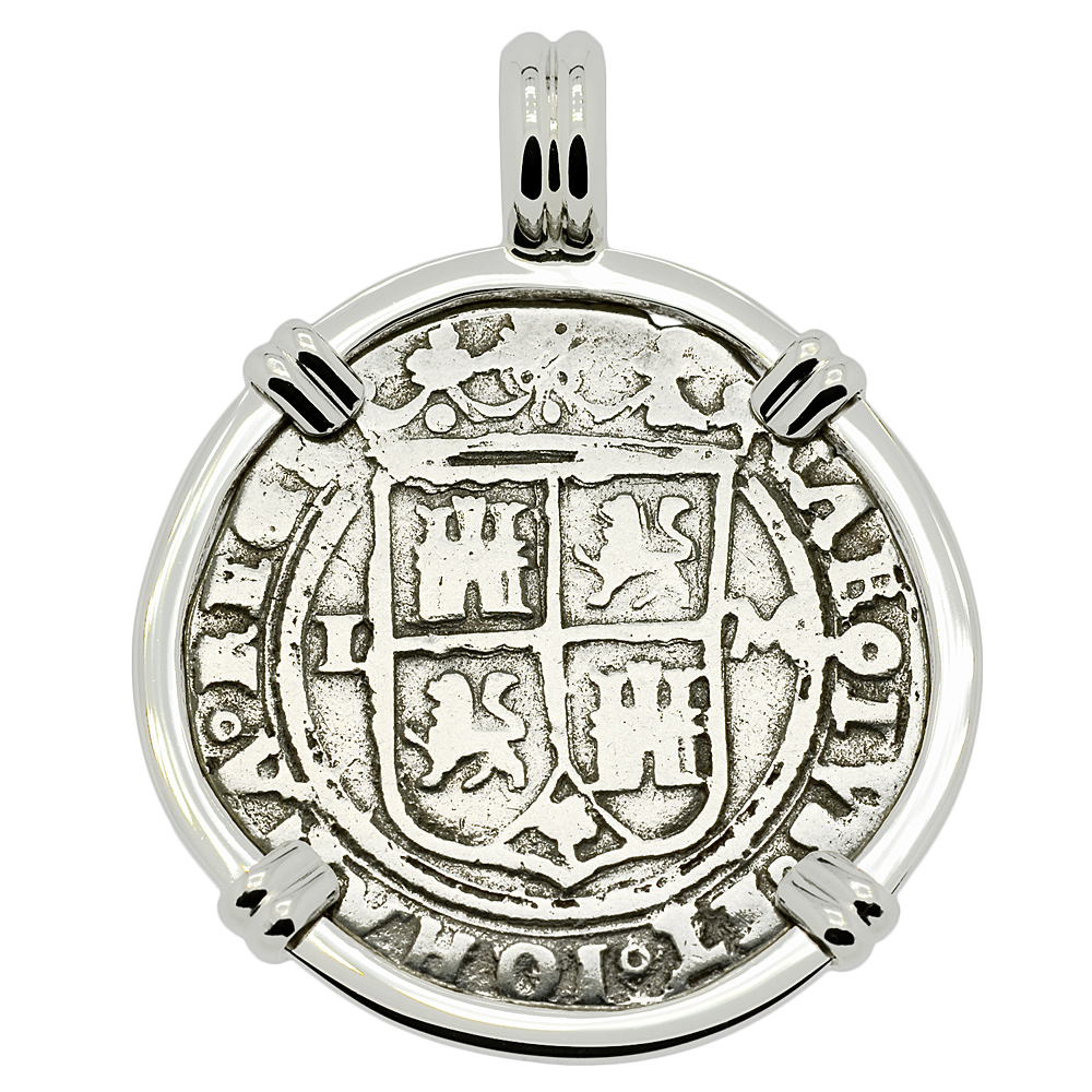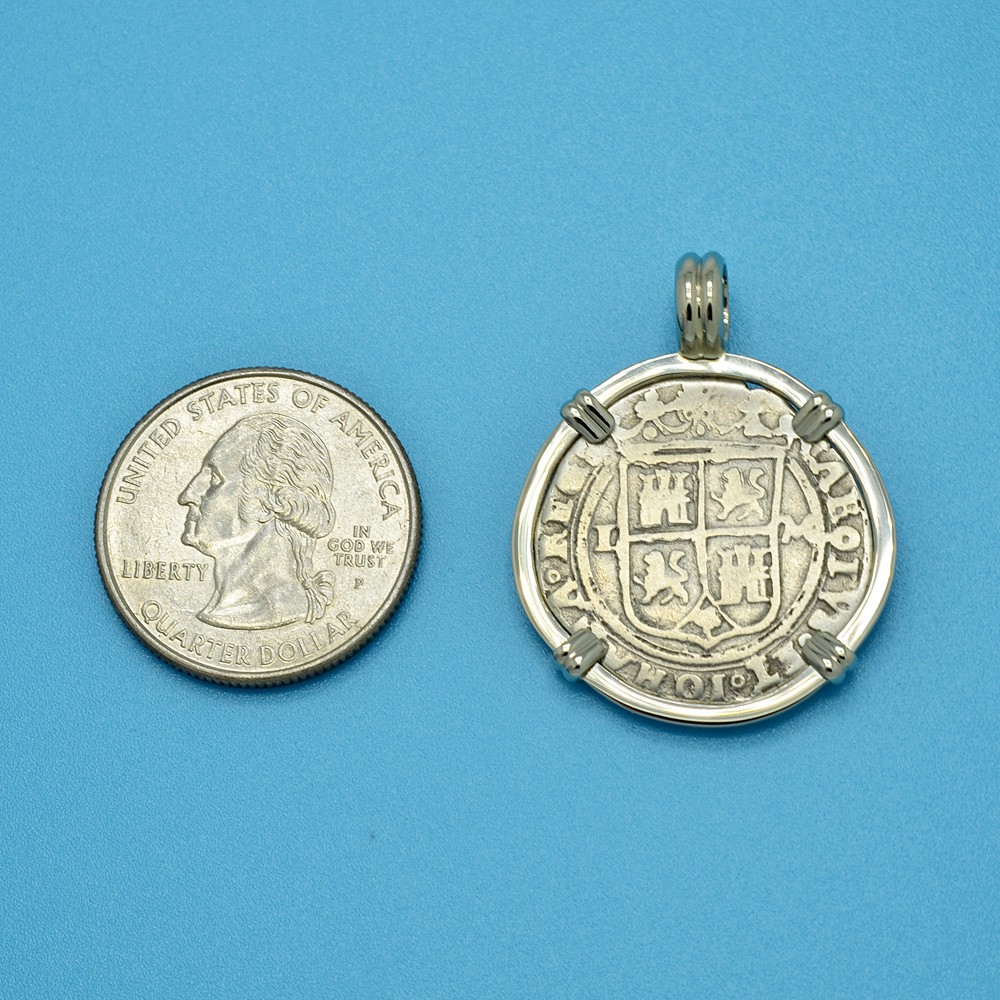 Coinage of this historical period were hand struck from dies and cut to weight according to the Spanish monetary system. Minted in five denominations in silver, the largest was the 8 reales, which was famous in the colonies and among pirates as a “piece of eight.” This coin shows the Johanna & Charles crowned coat of arms and on the reverse is the Pillars of Hercules.