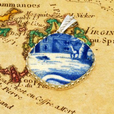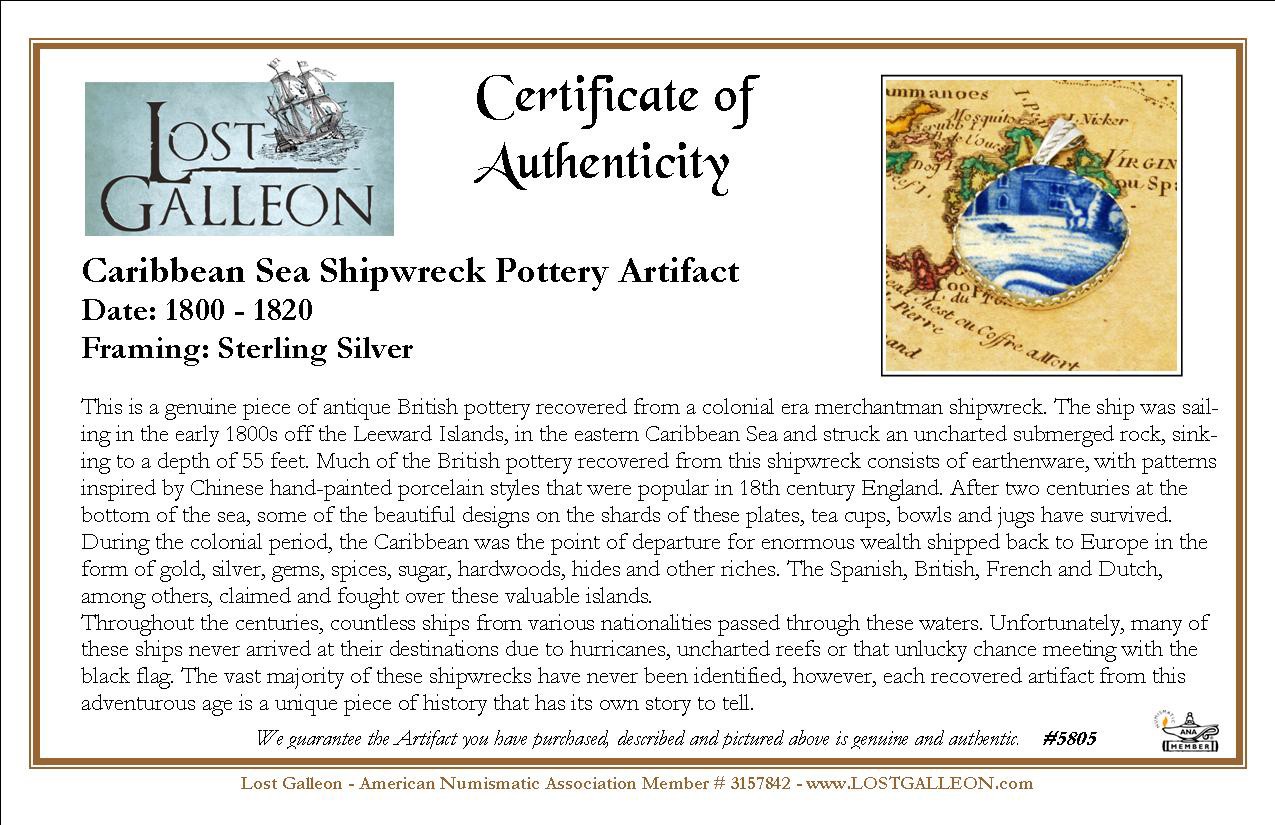 This is a genuine piece of antique British pottery recovered from a colonial era merchantman shipwreck. The ship was sailing in the early 1800s off the Leeward Islands, in the eastern Caribbean Sea and struck an uncharted submerged rock, sinking to a depth of 55 feet. Much of the British pottery recovered from this shipwreck consists of earthenware, with patterns inspired by Chinese hand-painted porcelain styles that were popular in 18th century England. After two centuries at the bottom of the sea, some of the beautiful designs on the shards of these plates, tea cups, bowls and jugs have survived.