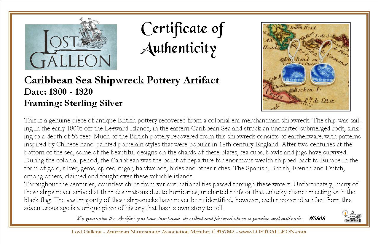 This is a genuine piece of antique British pottery recovered from a colonial era merchantman shipwreck. The ship was sailing in the early 1800s off the Leeward Islands, in the eastern Caribbean Sea and struck an uncharted submerged rock, sinking to a depth of 55 feet. Much of the British pottery recovered from this shipwreck consists of earthenware, with patterns inspired by Chinese hand-painted porcelain styles that were popular in 18th century England. After two centuries at the bottom of the sea, some of the beautiful designs on the shards of these plates, tea cups, bowls and jugs have survived.