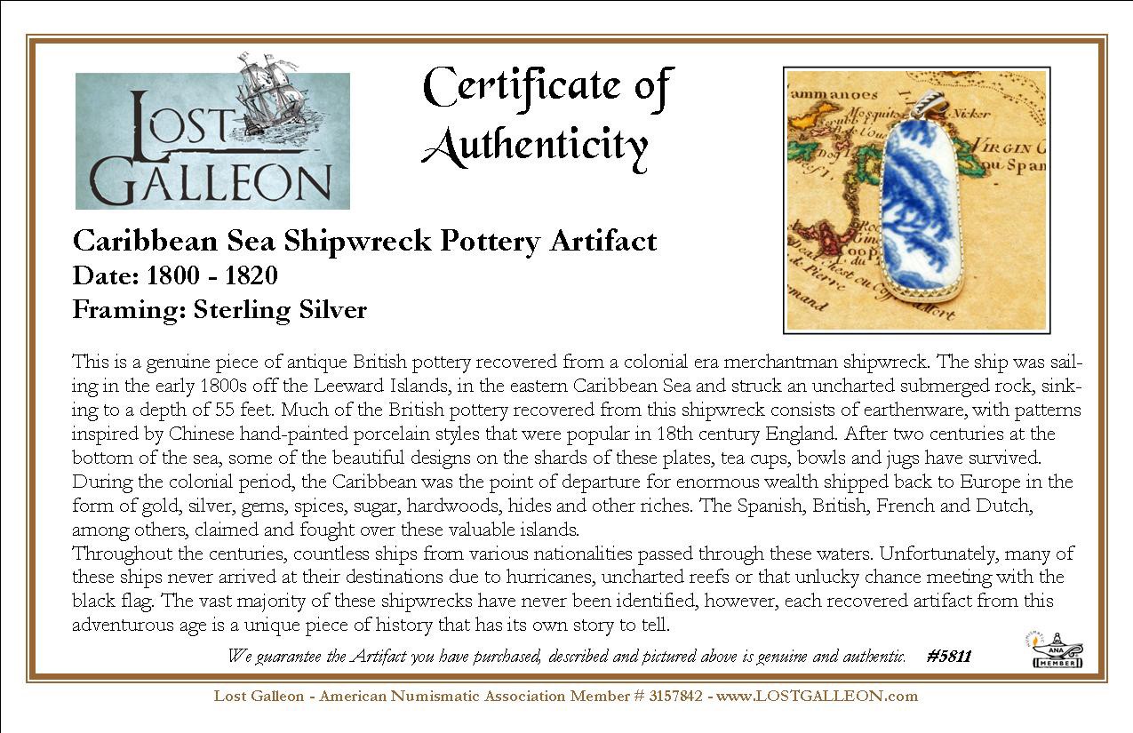 This is a genuine piece of antique British pottery recovered from a colonial era merchantman shipwreck. The ship was sailing in the early 1800s off the Leeward Islands, in the eastern Caribbean Sea and struck an uncharted submerged rock, sinking to a depth of 55 feet. Much of the British pottery recovered from this shipwreck consists of earthenware, with patterns inspired by Chinese hand-painted porcelain styles that were popular in 18th century England. After two centuries at the bottom of the sea, some of the beautiful designs on the shards of these plates, tea cups, bowls and jugs have survived.