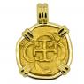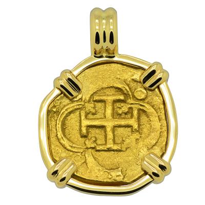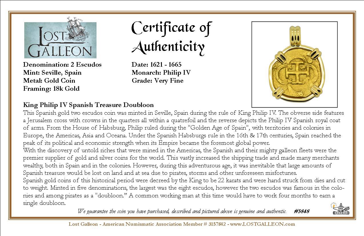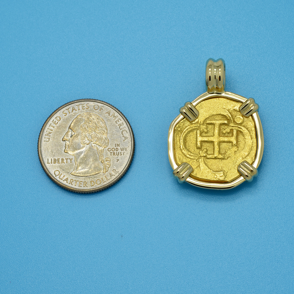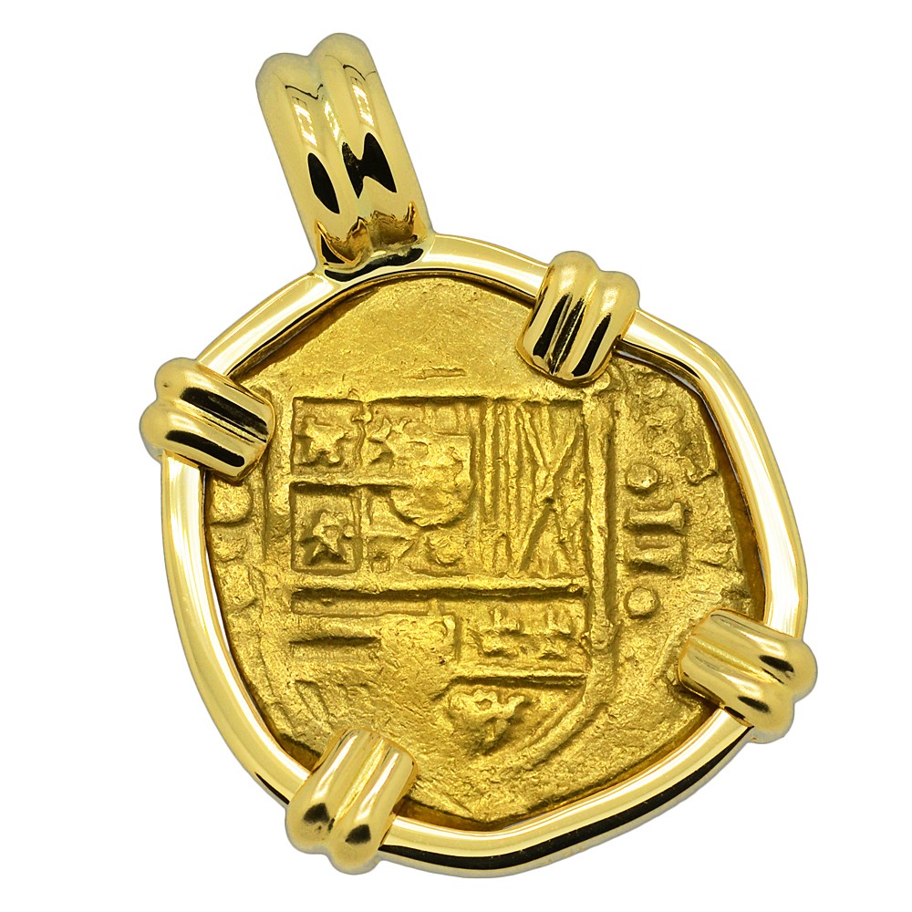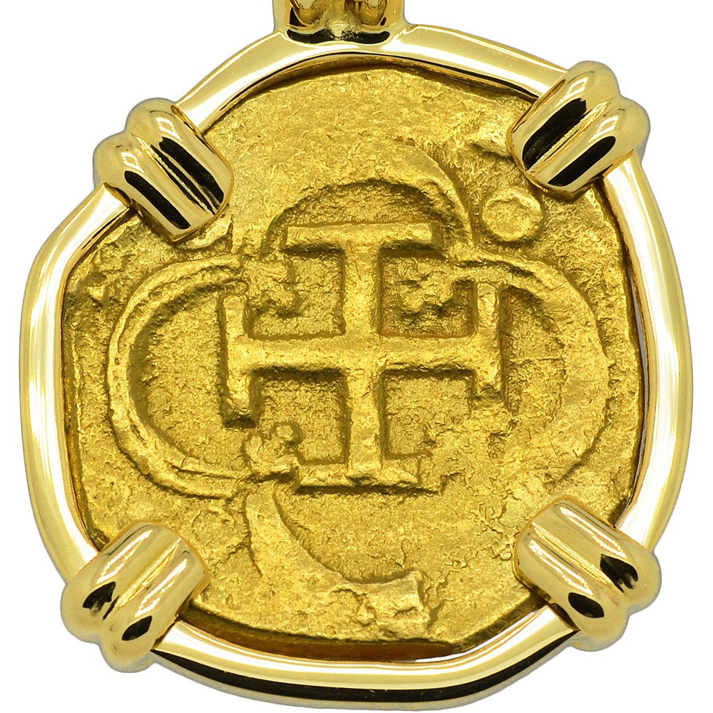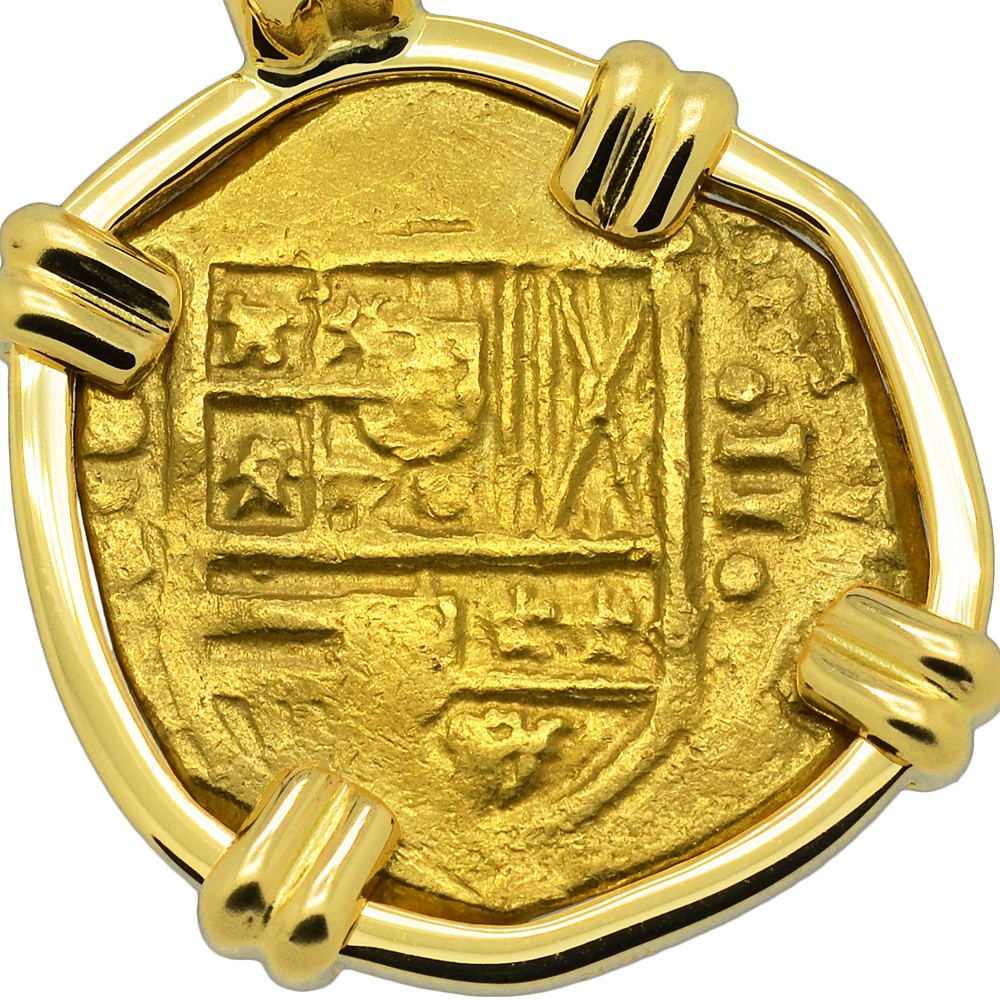 Spanish gold coins of this historical period were decreed by the King to be 22 karats and were hand struck from dies and cut to weight. Minted in five denominations, the largest was the eight escudos, however the two escudos was famous in the colonies and among pirates as a "doubloon.” A common working man at this time would have to work four months to earn a single doubloon.