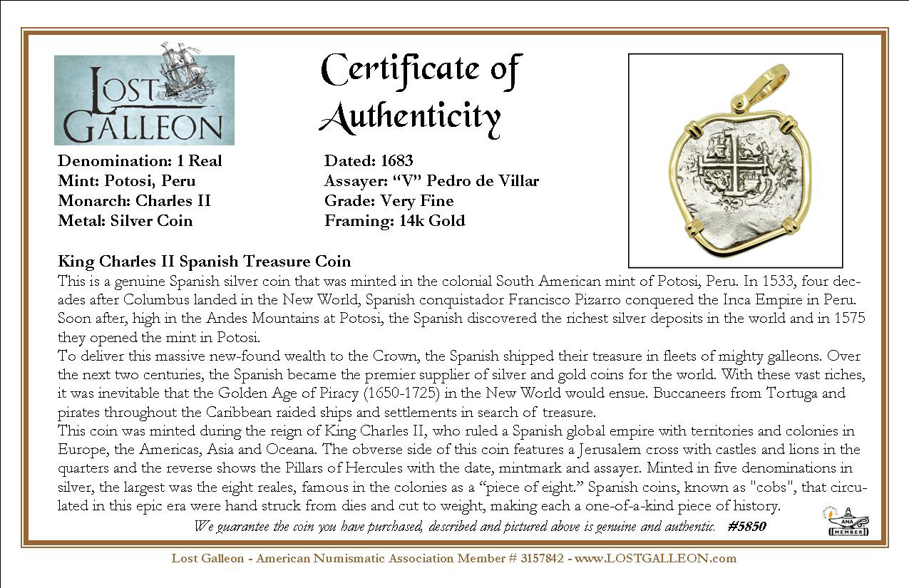 This coin was minted during the reign of King Charles II, who ruled a Spanish global empire with territories and colonies in Europe, the Americas, Asia and Oceana. The obverse side of this coin features a Jerusalem cross with castles and lions in the quarters and the reverse shows the Pillars of Hercules with the date, mintmark and assayer. Minted in five denominations in silver, the largest was the eight reales, famous in the colonies as a “piece of eight.” Spanish coins, known as "cobs", that circulated in this epic era were hand struck from dies and cut to weight, making each a one-of-a-kind piece of history.